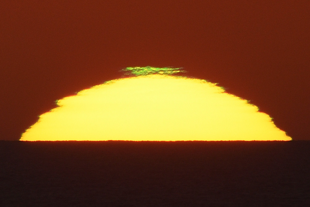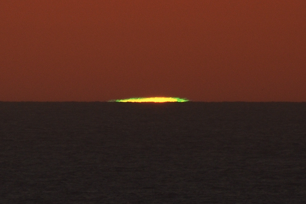 Dans ses derniers instants, notre étoile affiche une forme qui n'a rien de commun avec un coucher habituel : en 6.2, ses deux extrémités sont relevées et, en 6.3 et 6.4, il est réduit à un simple trait horizontal. Il est absent de la dernière image (6.5) mais une ligne horizontale très brillante apparaît juste au-dessus de l'horizon marin. Cette ligne était déjà présente dans les images précédentes et, dans l'image 6.6, qui est un agrandissement de 6.5, une structure plus fine est discernable par la présence d'une ligne horizontale sombre qui la sépare en deux parties sur toute sa longueur. Peut-être s'agit-il du même effet de la réfraction qui s'appliquerait à un groupe de nuages situés très en-dessous de l'horizon marin et dont l'image, comme pour le Soleil, serait très surélevée et réduite à une ligne horizontale.