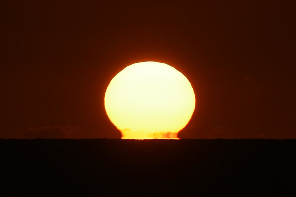 Comme pour des objets terrestres, le Soleil peut subir le phénomène de mirage inférieur avec la présence d'une image inversée sous l'image directe. La surface de la mer présente un grand avantage par rapport à une surface terrestre : sa planéité assure que les couches d'air successives offrent un profil vertical de température plus régulier qu'au-dessus d'un relief terrestre d'altitude et de nature souvent variables. Les mirages inférieurs qui en résultent montrent alors la forme caractéristique du Soleil en omega Ω avec l'apparition d'une image secondaire inversée sous le Soleil. Toutes les photographies présentées dans cette page ont été effectuées au bord de la mer avec un point d'observation à une altitude d'environ 2 m.