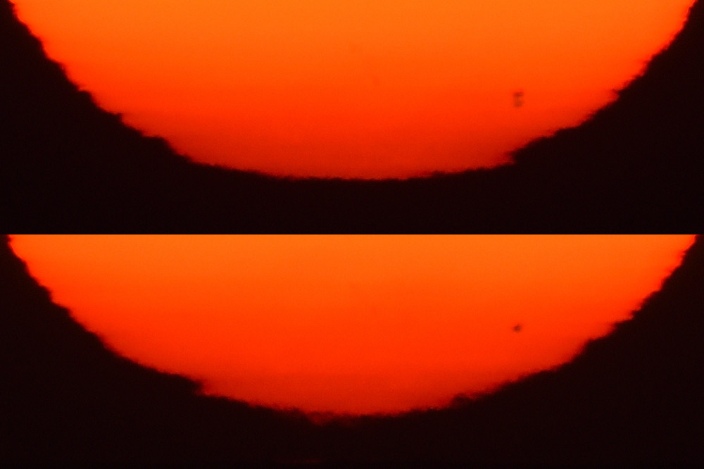 Lors d'une autre observation en mai 2025 depuis Anglet (Pyrénées-Atlantiques), un groupe de taches a subi un fort étirement vertical juste avant sa disparition sous l'horizon. Le temps écoulé entre les deux images est de 19 secondes.