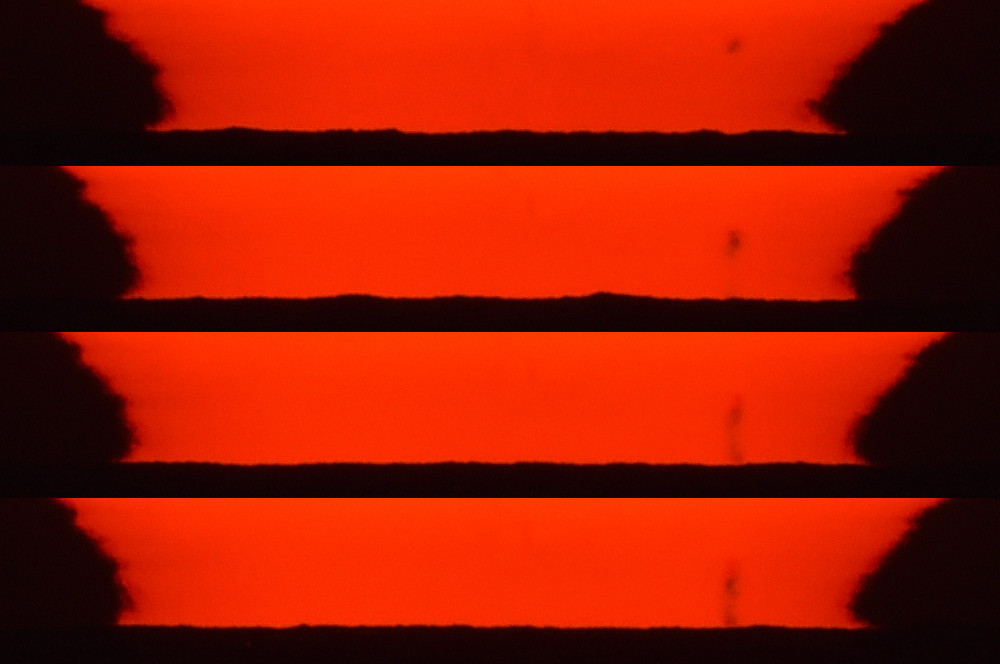 Enfin, la séquence 4.4 correspond au passage de la tache par un niveau atmosphérique qui provoque le mirage inférieur de l'image 4.5. Dans chacune des quatre images, la bande noire inférieure est l'horizon marin et la ligne de symétrie du mirage inférieur est située un peu au-dessus. Le Soleil étant plus bas que dans 4.2 et 4.3, la netteté de la tache est de moindre qualité mais il apparaît clairement que, de haut en bas, la tache se dédouble en une image supérieure et une image inférieure. La tache s'allonge dans la deuxième image (en partant du haut), commence à se séparer dans la troisième pour, dans la dernière image, en bas, se montrer en deux parties nettement distinctes. Le temps écoulé de la première à la quatrième étape est de 4.5 secondes.