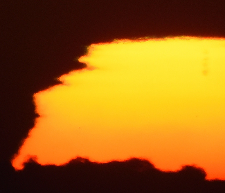 La réfraction très intense a produit un Soleil très aplati (image 3.1) et des étirements verticaux spectaculaires pour une forêt située à une centaine de kilomètres du site d'observation (image 3.2). Au cours de la descente du Soleil vers l'horizon, il est passé par un niveau de forte variation de l'indice de réfraction qui a causé un dédoublement de la tache solaire présente au centre de l'image 3.1. Les deux images de cette tache apparaissent bien dans l'image 3.2 où les fortes turbulences altèrent grandement le contour du disque solaire par rapport à 3.1. Une petite précision technique est nécessaire à propos du fait que, dans 3.2, le Soleil semble très légèrement plus large que dans 3.1. En 3.1, le Soleil était plus élevé qu'en 3.2, donc beaucoup plus brillant ce qui a nécessité, pour bien faire apparaître la tache, d'appliquer un contraste très important lors du traitement de l'image par ordinateur : les bords droit et gauche de 3.1 en ont été atténués, faisant paraître le Soleil moins large que dans 3.2.