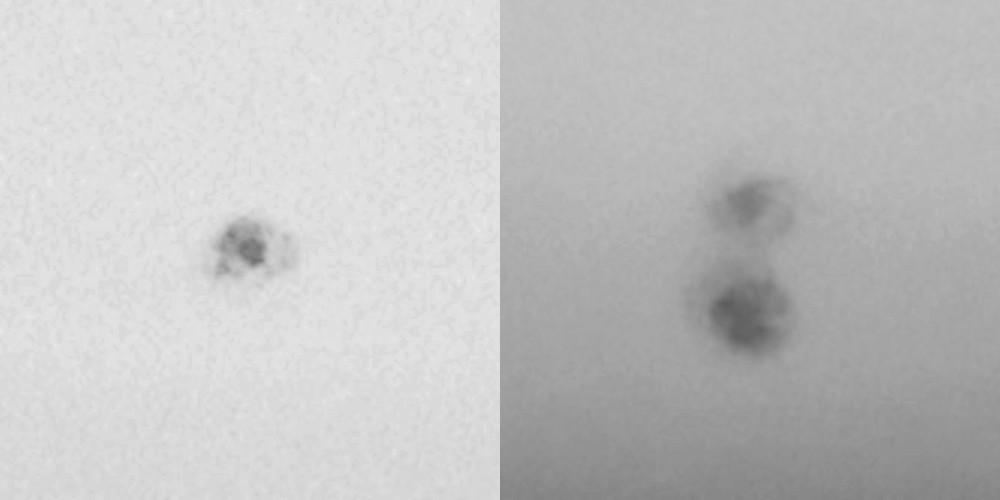 La comparaison des deux situations pour la tache est proposée dans les images 3.3 (couleurs plus ou moins réalistes) et 3.4 (noir et blanc avec accentuation du contraste). Dans 3.4, étant données les conditions atmosphériques (réfraction intense donc fortes turbulences), la qualité de l'image de gauche (issue de 3.1) est remarquable car on y voit très nettement la zone centrale plus sombre que la partie périphérique. L'image de droite (issue de 3.2) montre le mirage qui s'applique à cette tache avec une qualité d'image très inférieure : les deux taches, disposées verticalement, sont deux images de la même tache présentée dans la partie gauche. Malheureusement, la qualité insuffisante de la photographie ne permet pas de préciser s'il s'agit d'images droites ou inversées.