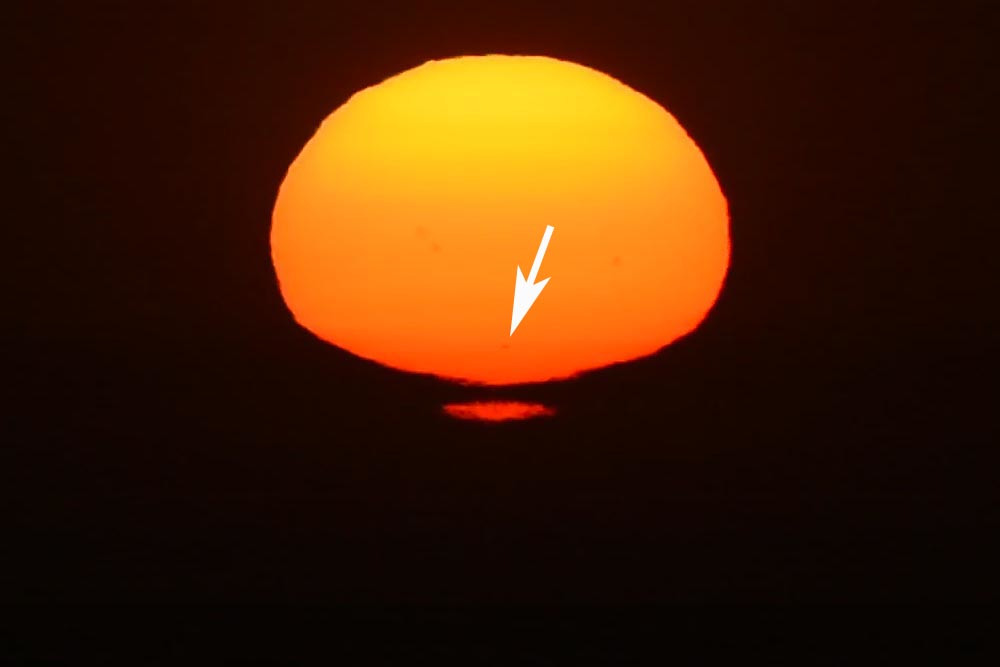 Dans les images extraites de la vidéo (résolution très inférieure à celle d'une photographie), la tache solaire est très faiblement visible dans la première image (flèche, image 2.1), puis elle apparaît en plusieurs exemplaires dans les suivantes (2.2 et 2.3).