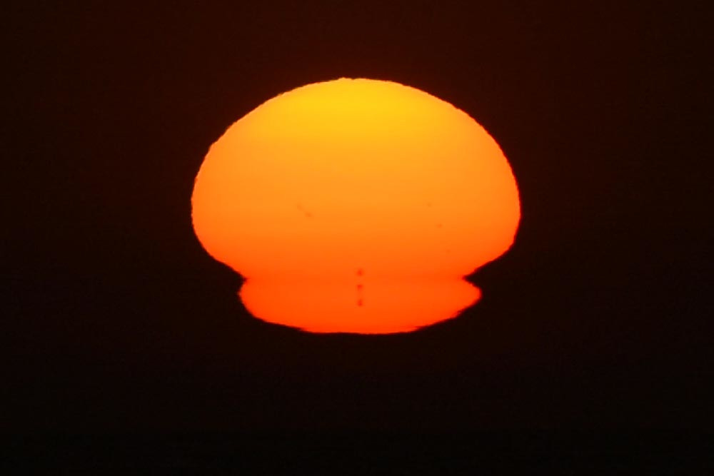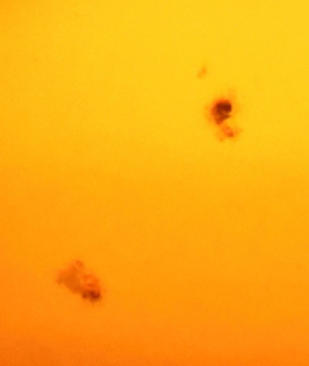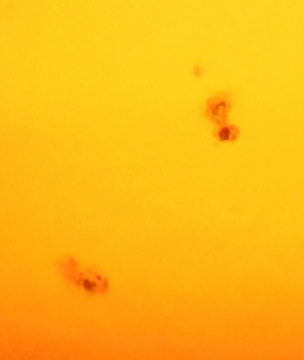 Les images suivantes, effectuées à Biarritz au coucher du Soleil, présentent le dédoublement d'une tache solaire au passage du Soleil par une zone où l'indice de réfraction a varié brusquement. Alors que les turbulences atmosphériques étaient particulièrement importantes et dégradaient beaucoup la qualité des photographies, la prise de nombreuses images a permis, par chance, d'en obtenir une (une seule !) avec une netteté telle que la principale tache solaire présente ce jour-là a pu montrer quelques détails dans sa structure.