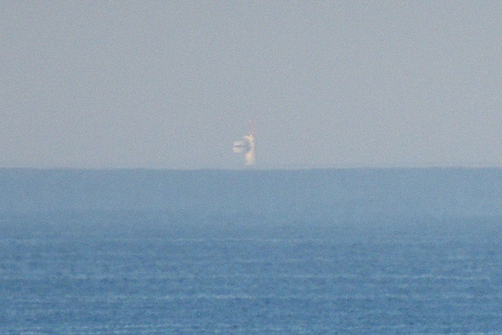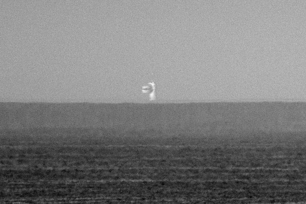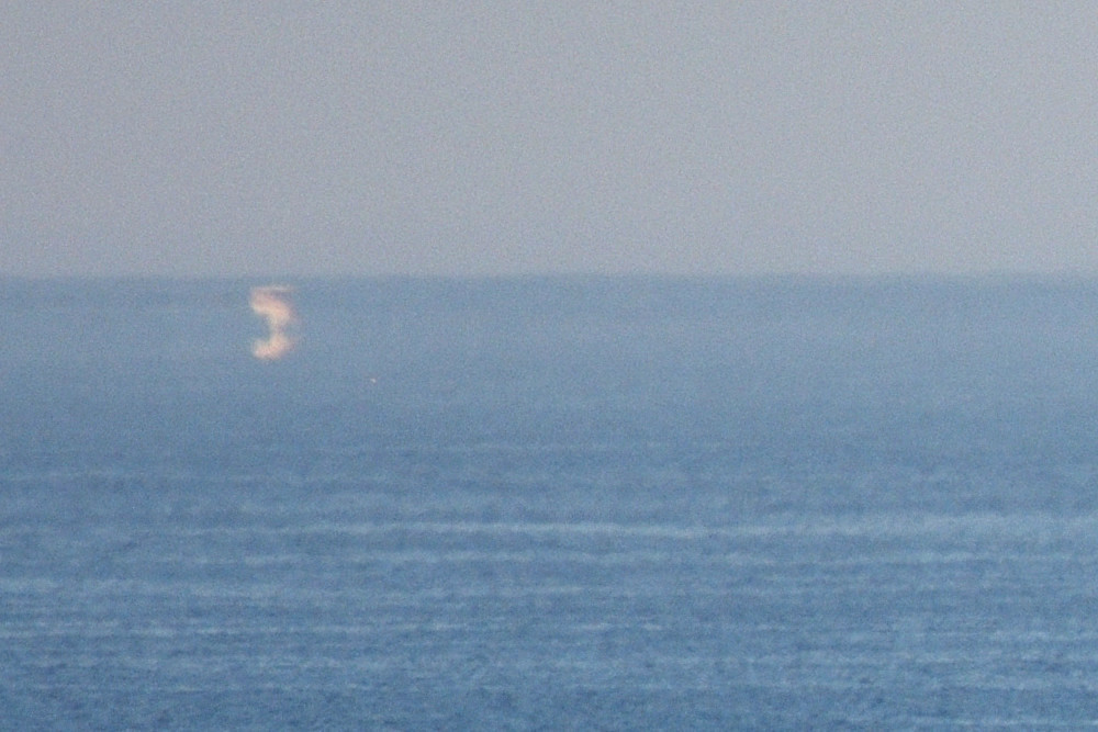 Un autre événement spectaculaire s'est produit un mois plus tôt, vu cette fois depuis l'esplanade du phare de Biarritz, vers le nord, à l'altitude de 33 m. Ici encore l'image 2.1 est floue, mais on peut discerner que la zone située immédiatement sous l'image très comprimée du sémaphore de Messanges est dépourvue de vagues, qui pourtant apparaissent normalement un peu plus bas. En transformant l'image en noir et blanc et en agissant de façon importante sur le contraste, un étirement vertical de 2,5' devient discernable (2.2). Il s'agirait donc d'une situation semblable à la précédente : étirement fort avec compression au-dessus sans apparition d'une autre image. L'image 2.3 correspond à une situation standard, observée un autre jour de novembre 2024 au même endroit, dans laquelle la houle est mieux visible. En l'absence de repère fixe, les images sont alignées par rapport au niveau de l'eau.