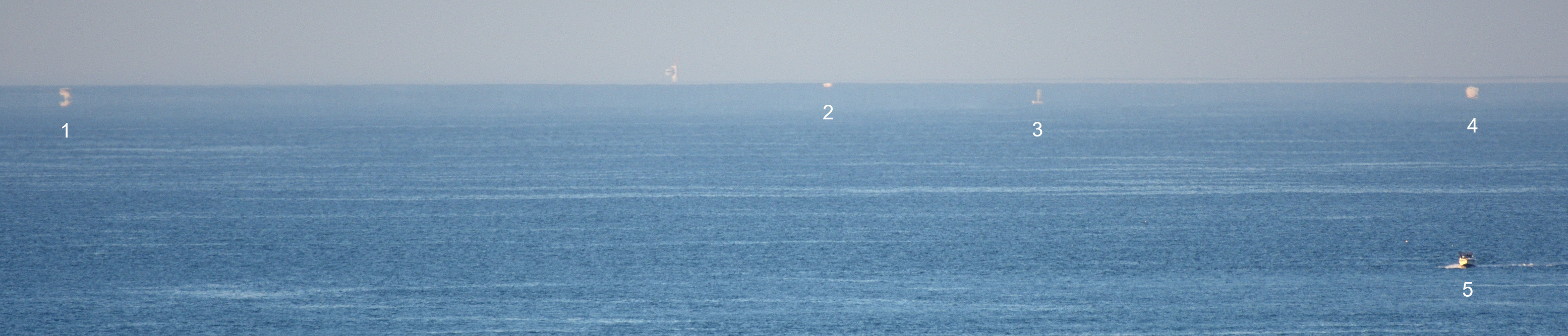 Un dernier élément doit être apporté pour une description complète de cet événement exceptionnel : la déformation des rayons lumineux issus de sources présentes dans la zone où se forme le "mur d'eau". Dans l'image 2.4, qui est la même que 2.1 mais avec un cadre plus large, cinq objets sont numérotés : les numéros 1, 2 et 4 sont situés dans la zone perturbée par la réfraction, le n° 3 est une bouée verticale au début de cette zone et le n° 5 est un petit bateau très en avant. La bouée et ce bateau ne sont pas affectés par le phénomène et apparaissent normalement. Au contraire, le n°1 montre de façon évidente une ligne de symétrie (image 2.5) tandis que les images des n° 2 et 4 sont imprécises. Le bateau n° 5 est situé dans le prolongement de la digue de l'embouchure de l'Adour à Anglet, à 4,6 km. Le phénomène se forme donc quelque part entre 4.6 km et 37.5 km, la distance du sémaphore.