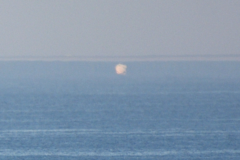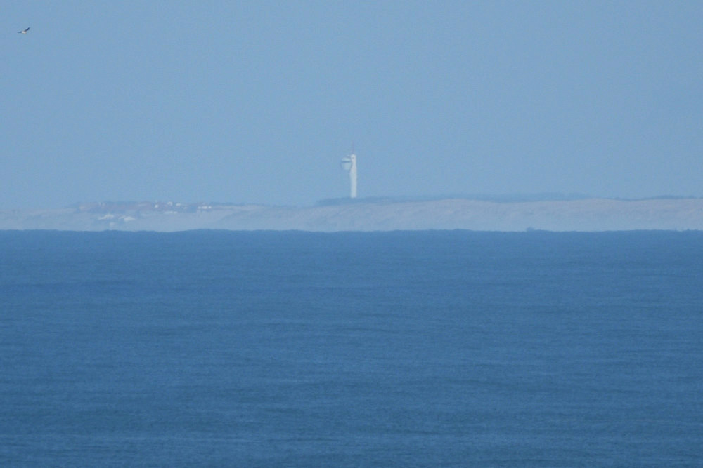Si on examine l'image 2.1 du sémaphore plus précisément, il apparaît très comprimé verticalement par rapport à son aspect habituel avec une hauteur de 1.6' en 2.1 par rapport à 3.1' en 2.3, c'est-à-dire que sa hauteur est divisée par 2 ! Il s'agit bien d'une compression de l'image de l'ensemble du bâtiment et pas d'une troncature de la partie basse du pylône car, à la base de celui-ci, on détecte faiblement une ligne sombre horizontale qui s'étend vers la droite et qui correspond au sommet de la forêt landaise, dont le prolongement vers la côte est visible dans la photographie 2.4 (à agrandir en cliquant puis se déplacer avec la barre inférieure). Sous la base du pylône, une zone apparemment vide et très fine semble exister au-dessus de la ligne de l'horizon marin. Le poste d'observation du sémaphore est à l'altitude de 75 m (hauteur 63 m5 + altitude de la base 12 m6).