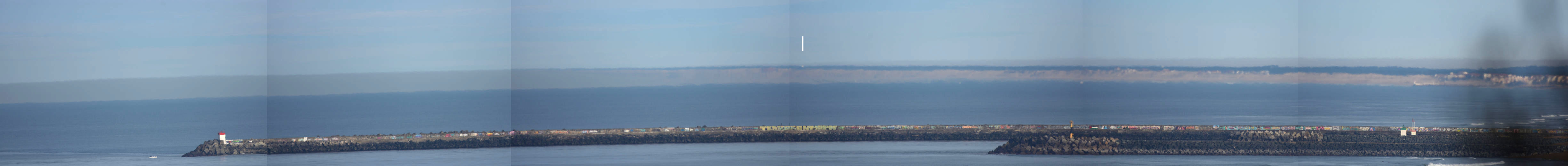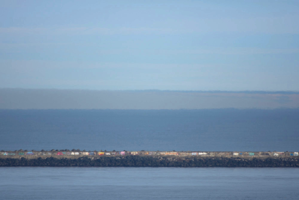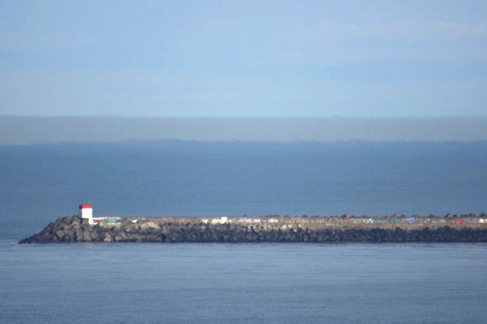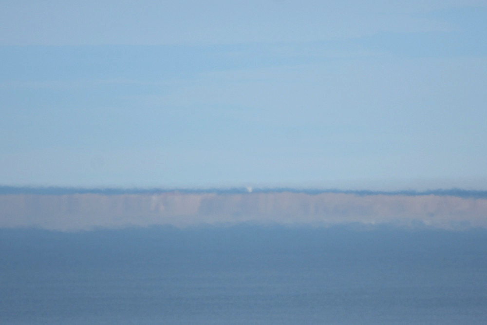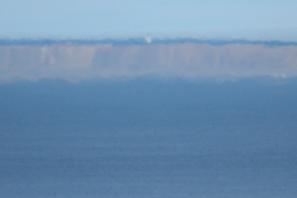 Dans l'image 1.4, la ligne de l'horizon marin montre de fortes irrégularités causées par les variations locales importantes de la réfraction. La bande sombre qui la surmonte est une couche de brume dont la limite supérieure est dans le prolongement de la limite supérieure de la zone très perturbée de 1.1. La zone de transition entre cette dernière et la couche de brume est visible dans l'image 1.5 : dans la partie droite on distingue la forêt landaise comme une fine bande sombre qui s'amenuise vers la gauche, et qui disparaît complètement vers le milieu de l'image, au profit de la bande de brume gris foncé. Une vue générale est proposée dans la composition 1.6 où le sémaphore est indiqué par un trait blanc au centre (cliquer sur l'image pour l'agrandir et la déplacer avec la barre horizontale qui apparaît). Le phénomène ne se limite donc pas au trajet de la lumière, il concerne aussi les aérosols. L'explication est probablement celle d'une situation étudiée par Luc Dettwiller dans son article "Phénomènes de réfraction atmosphérique terrestre"1 : une bande où les aérosols sont confinés en raison de la température qui y est inférieure à celle de la couche supérieure.