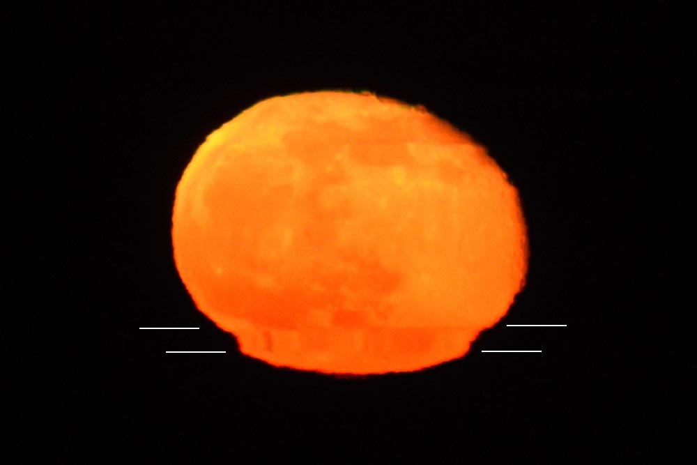 Deux jours après la Pleine Lune de décembre 2021, un étirement très marqué de 2,2' de la partie inférieure de la Lune (entre les lignes blanches) a rendu méconnaissables les détails de sa surface.