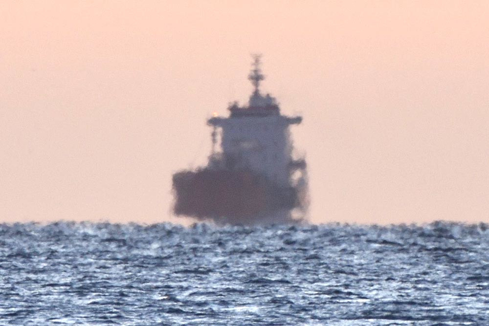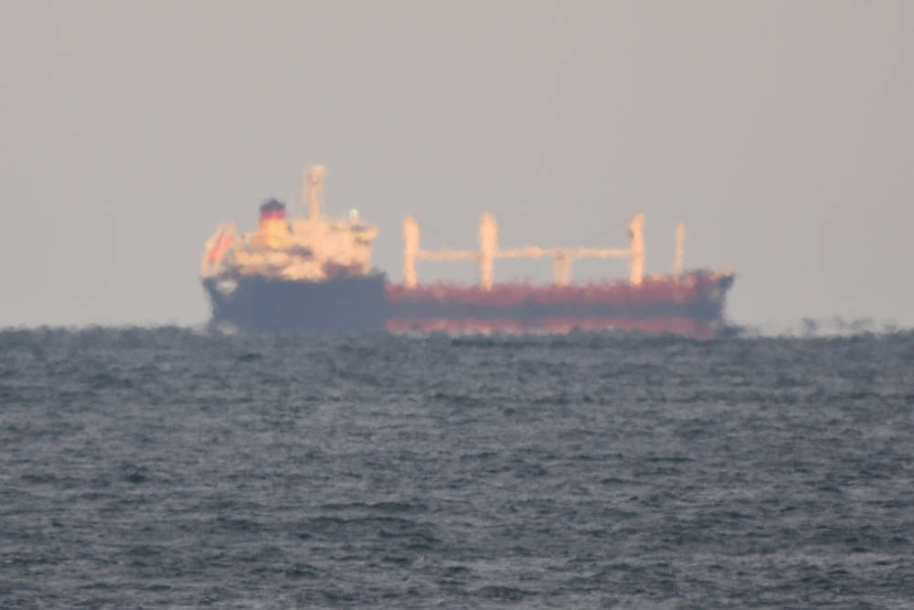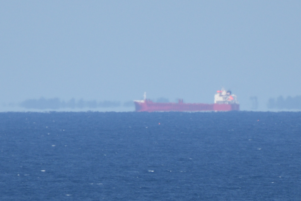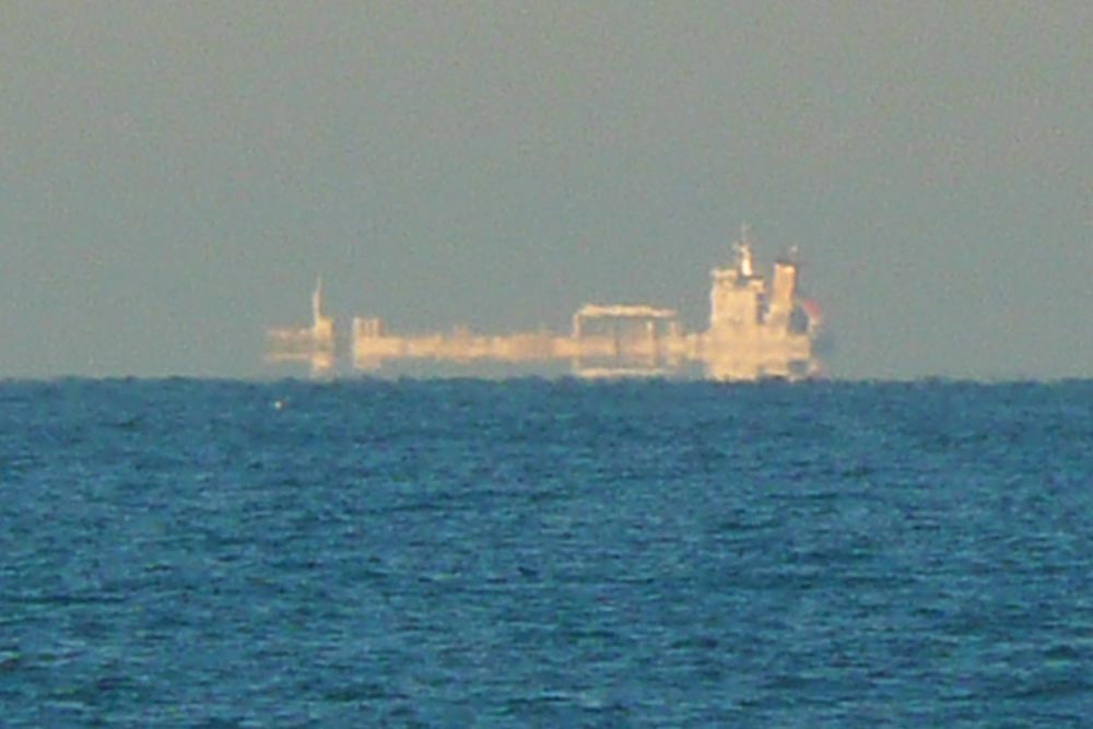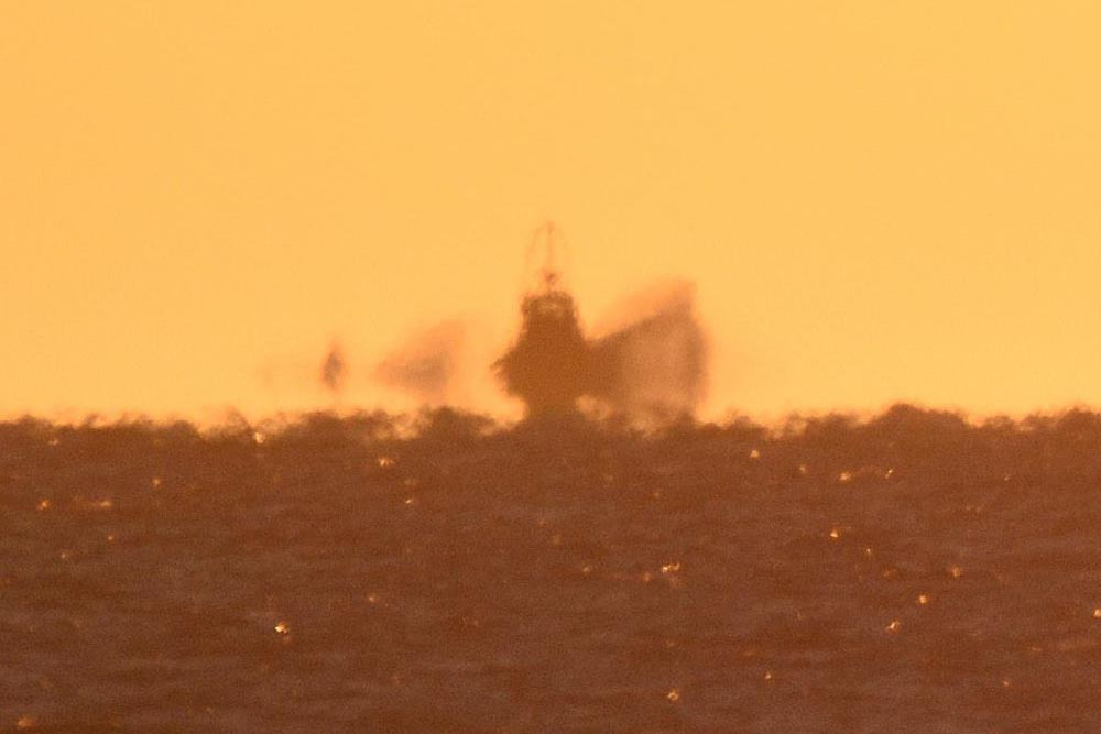 La ligne de symétrie pour l'eau expulsée par le remorqueur de l'image 1.3 semble flotter au-dessus de la mer. L'allure très découpée et changeante de l'horizon marin est due aux variations locales de la réfraction qui perturbent fortement la surface apparente de la mer.