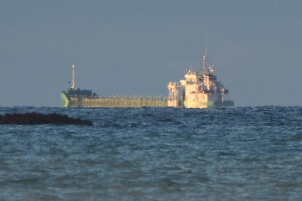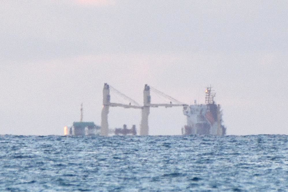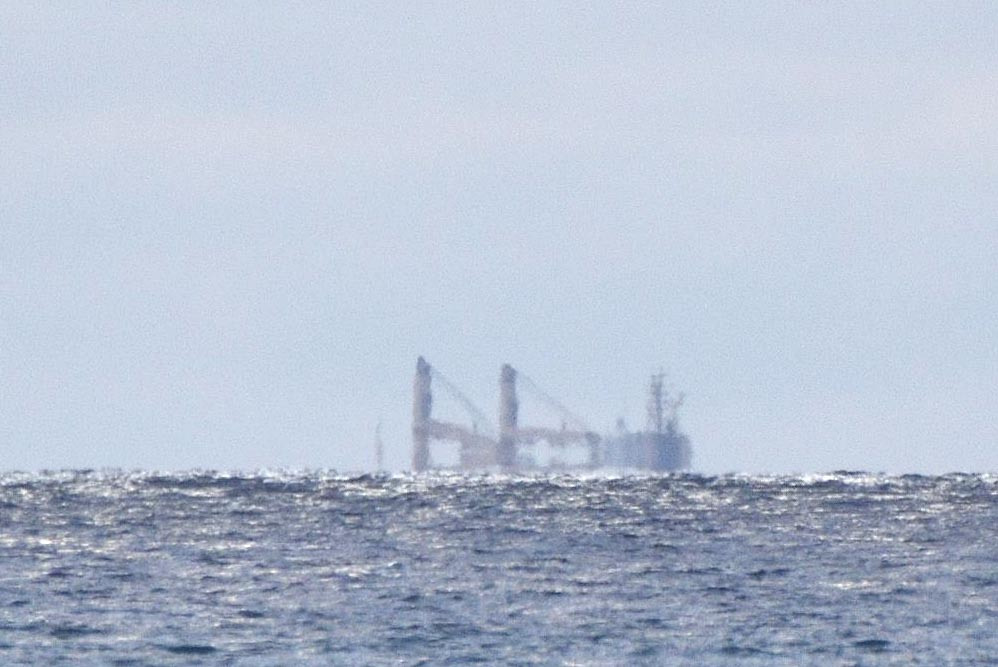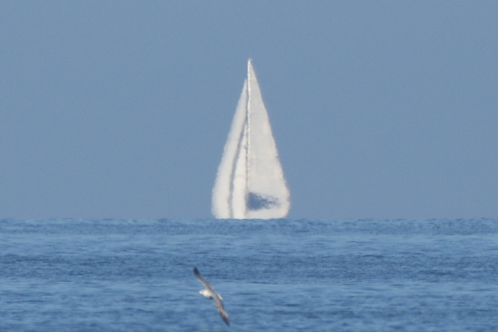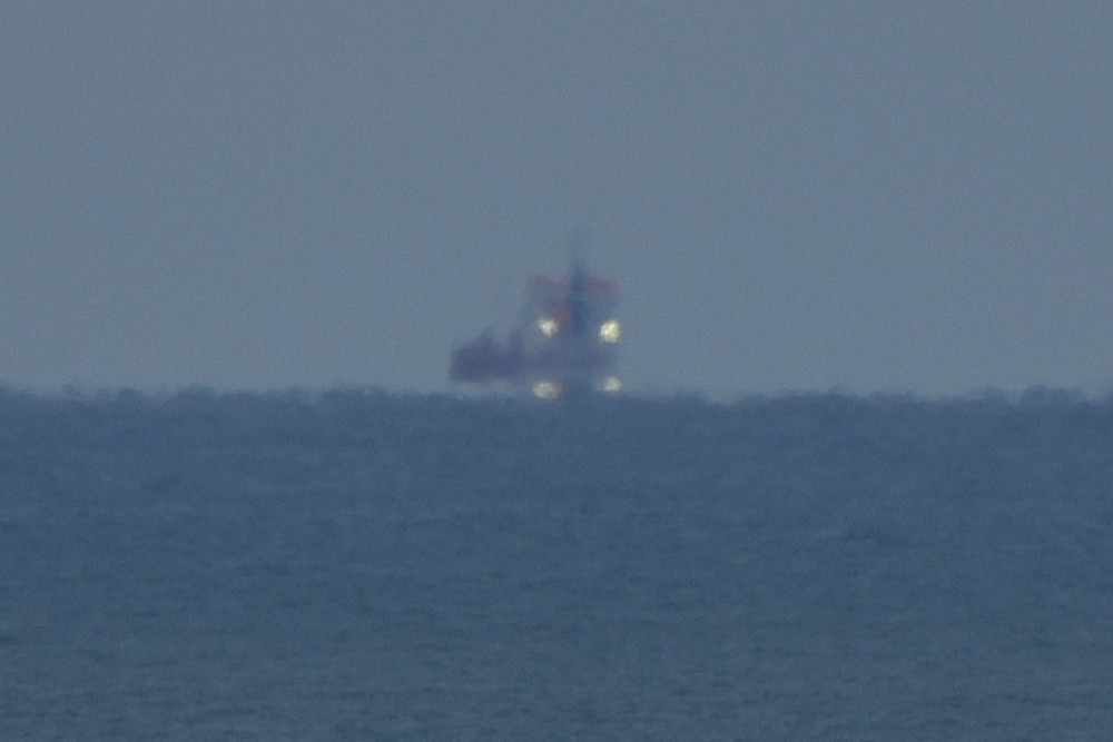 La ligne de symétrie pour l'eau expulsée par le remorqueur de l'image 1.3 semble flotter au-dessus de la mer. L'allure très découpée et changeante de l'horizon marin est due aux variations locales de la réfraction qui perturbent fortement la surface apparente de la mer.