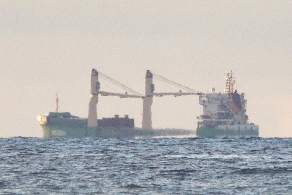 En 2.7, avec la luminosité faible d'une fin de journée nuageuse, un bateau semble flotter au-dessus de l'Océan Atlantique, dont l'image inférieure est identifiée par l'image en miroir de ses lumières.