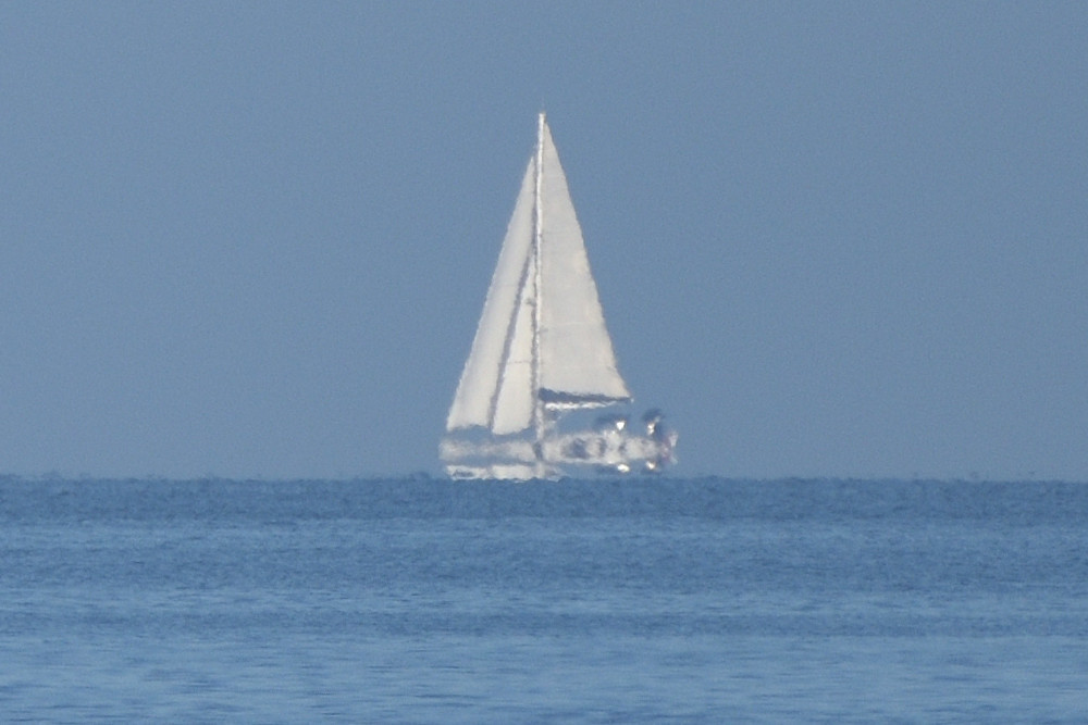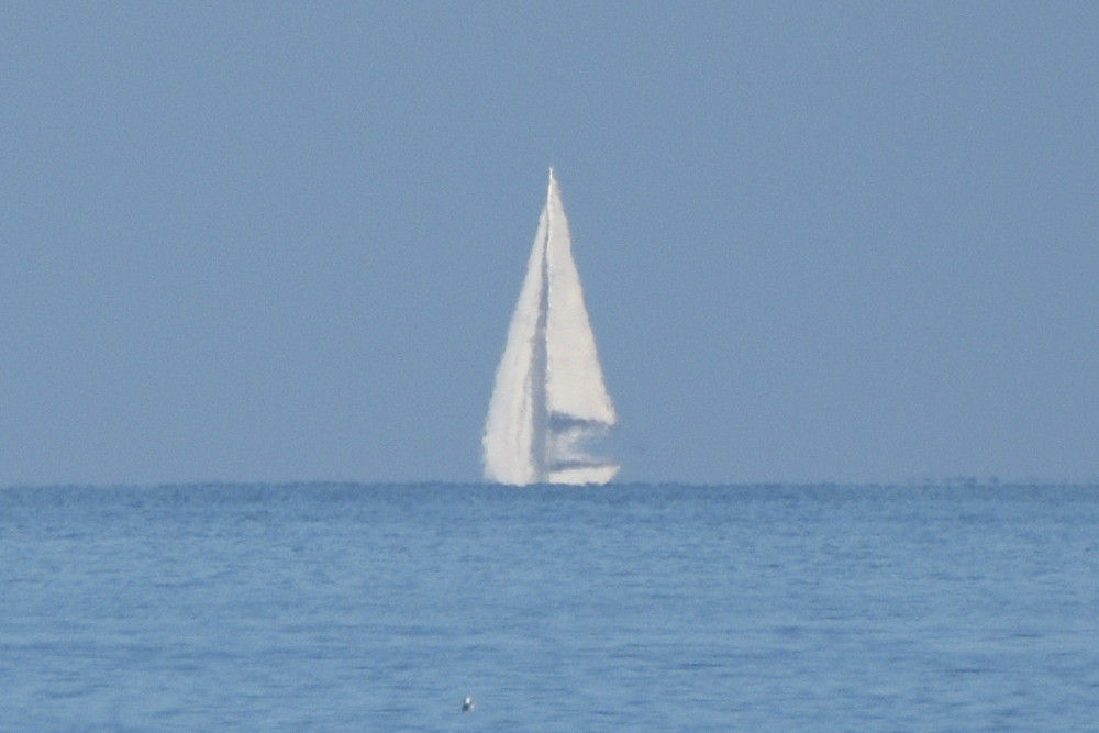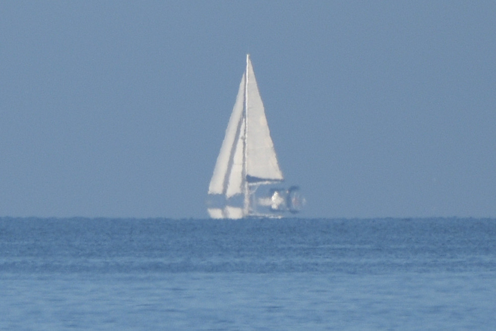 Quand un mirage inférieur s'insère sous l'image droite d'un bateau, il s'applique aussi à l'arrière-plan. Dans l'image 2.5, d'une part le bateau a une image inférieure inversée avec une mince bande de ciel entre celle-ci et l'océan, et d'autre part la forêt de pins de la côte landaise située derrière le bateau est elle aussi dupliquée à l'envers vers le bas. Photographie effectuée depuis le Domaine d'Abbadia à Hendaye.