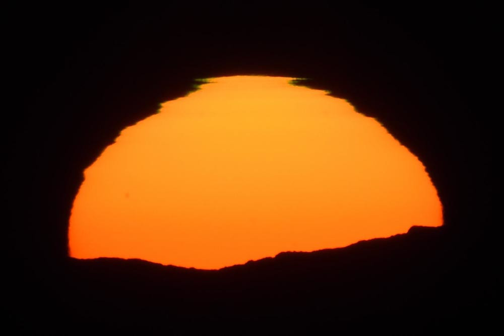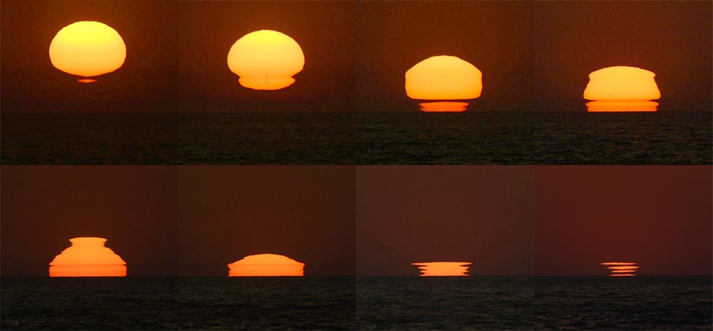Des mirages plus complexes, avec éventuellement plusieurs images supplémentaires en plus de l'image droite, peuvent survenir dans des situations où les deux types de gradient de température se succèdent (composition d'images 1.3). La variété des situations possibles est grande et on peut aussi observer un étirement vertical avec une compression sans image supplémentaire (1.4). Si on est dans une situation plus proche de l'atmosphère standard, on peut néanmoins assister à des cas de réfraction intéressants avec, dans le cas du Soleil, des lambeaux de notre étoile observés au-dessus ou au-dessous du limbe en raison de variations brusques de la température sur des hauteurs plus faibles (1.5).
