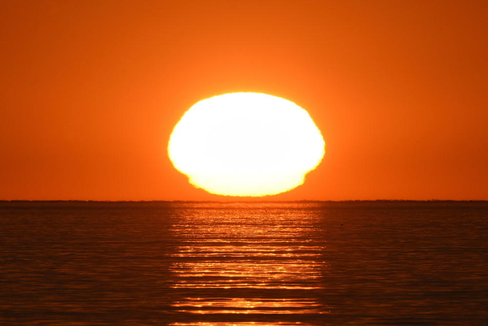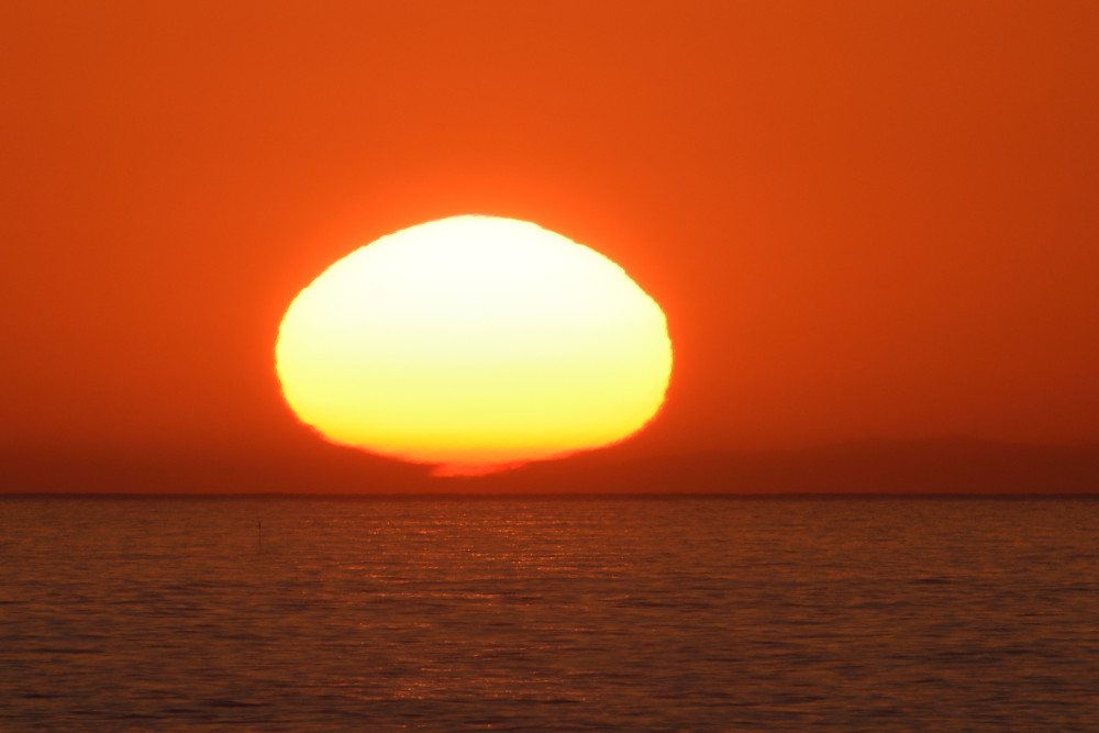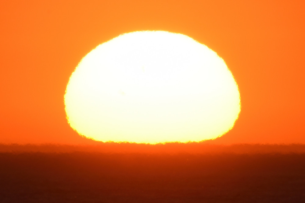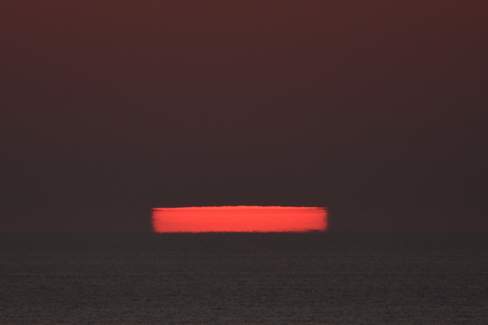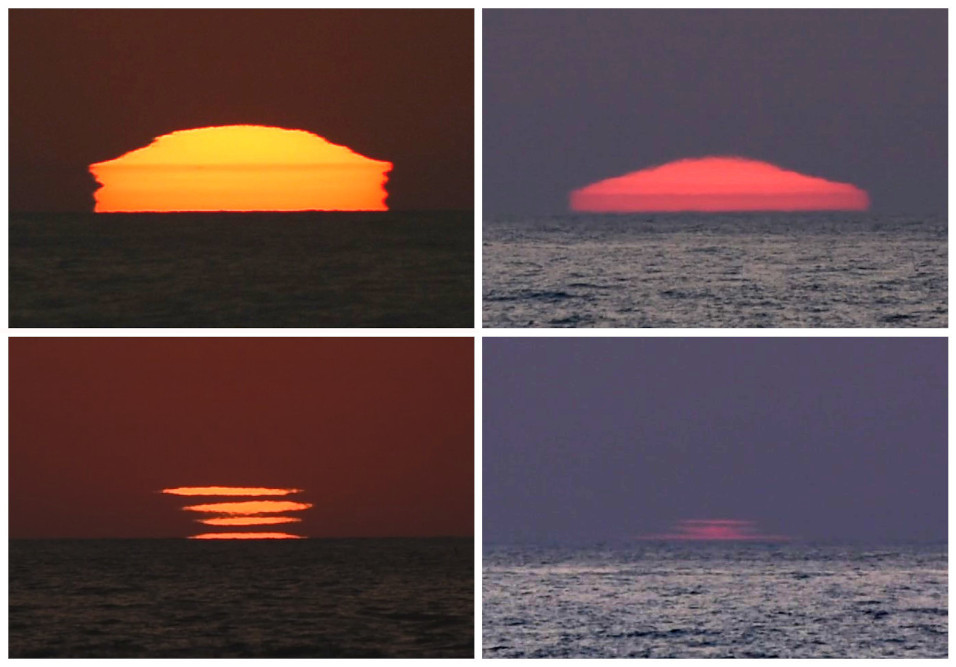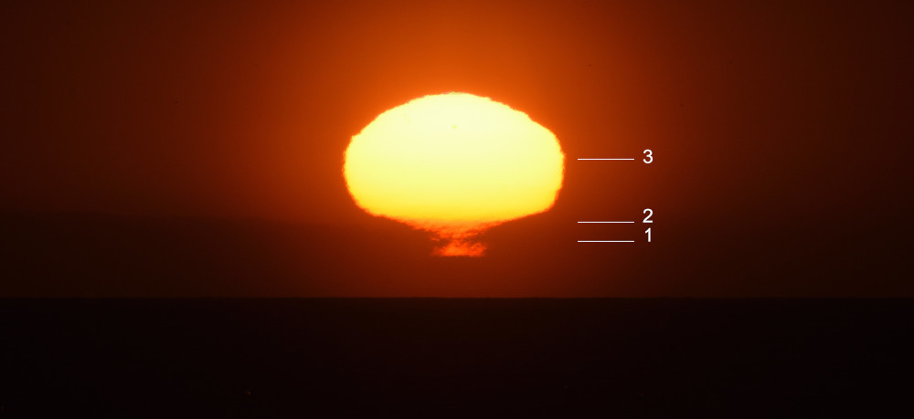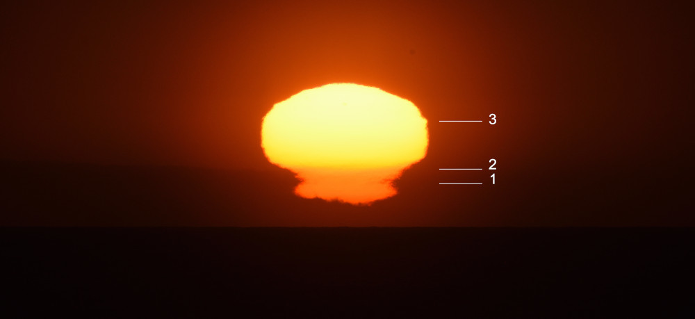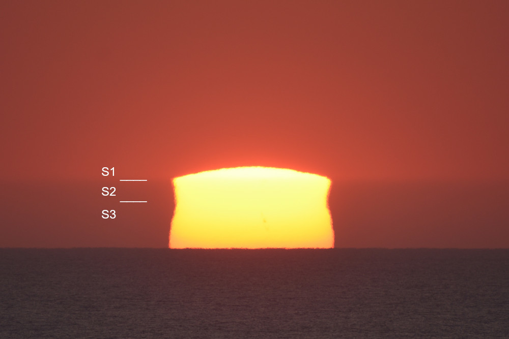 L'infinie diversité possible pour le profil vertical de température produit des formes et des évolutions toujours très étonnantes. Ainsi en juin 2022, depuis Leucate (Aude), le lever du Soleil a commencé par une fine ligne horizontale (2.1) et s'est terminé par une compression verticale très marquée (2.6). Les photographies ont été effectuées au bord de la mer.