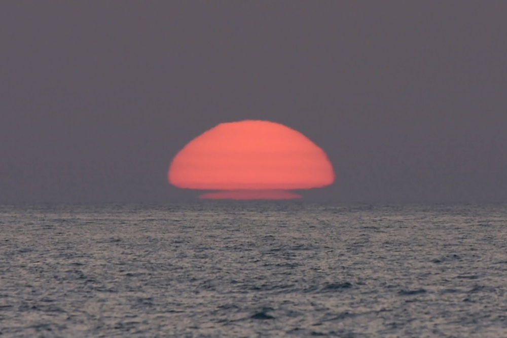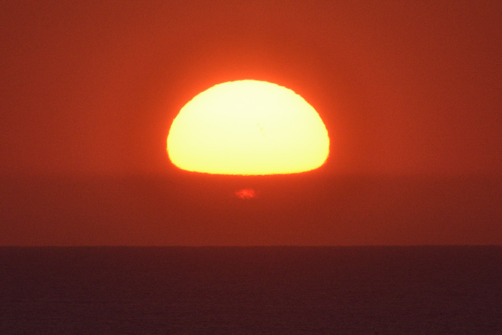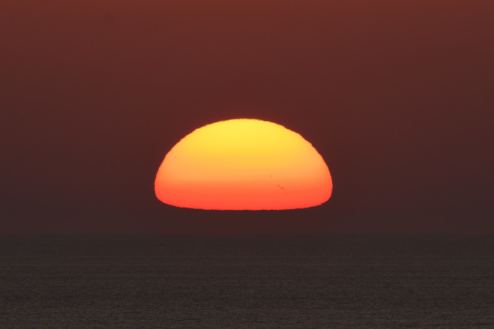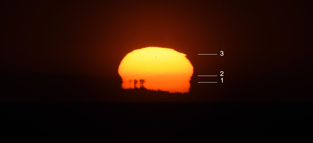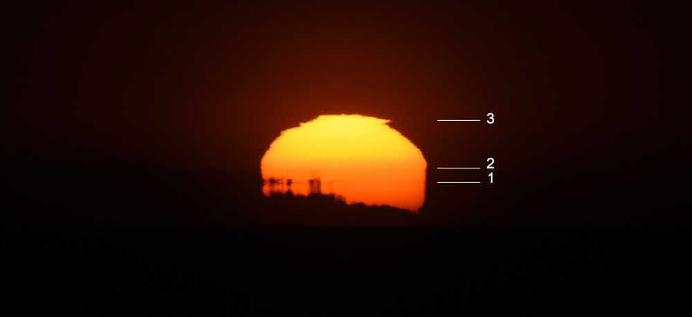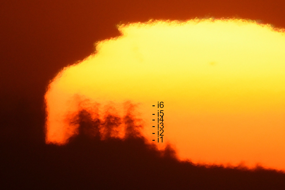 Le principal obstacle à l'observation du coucher du Soleil sur l'océan est le Mont Sollube derrière lequel le Soleil disparaît pendant la première moitié du mois d'octobre. Mais lors de l'observation présentée ici, après avoir subi un aplatissement très important et une forte asymétrie (15.1), une partie du Soleil a disparu derrière l'océan (15.4) ce qui a permis de distinguer une deuxième image (15.2), à gauche de la crête sud du Mont Sollube (qui est entièrement visible dans 15.5). Une bande d'absorption accompagne le phénomène.