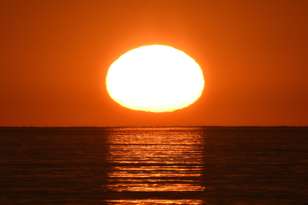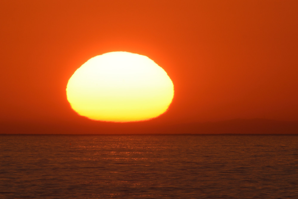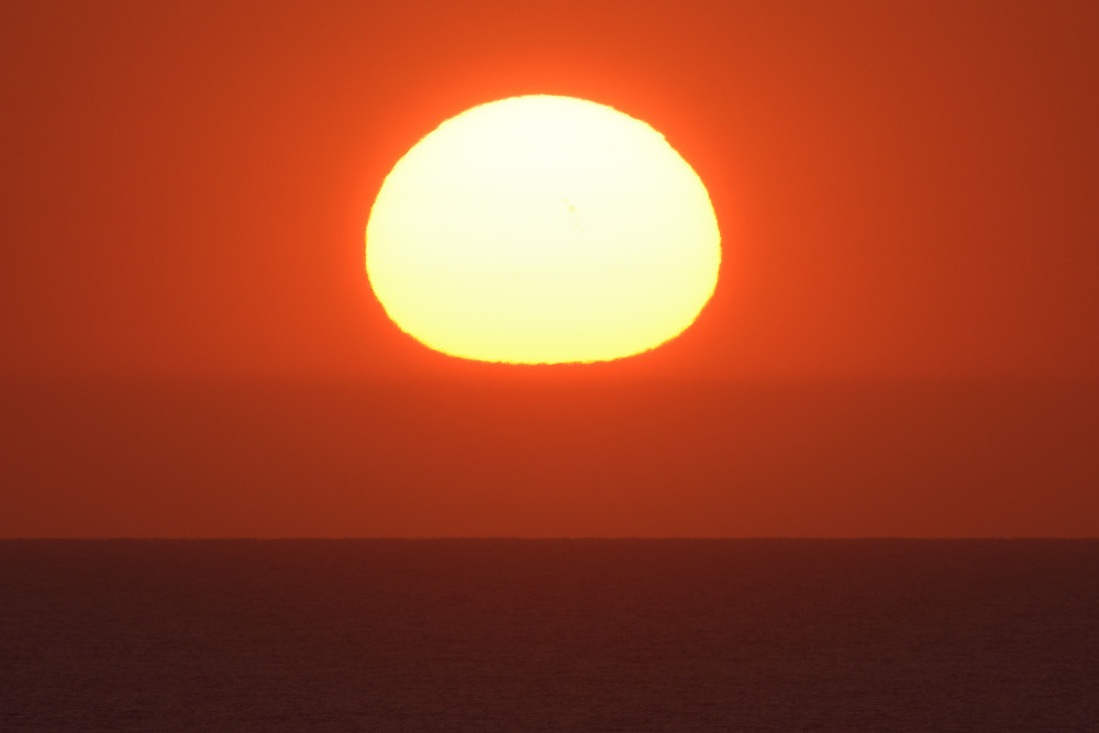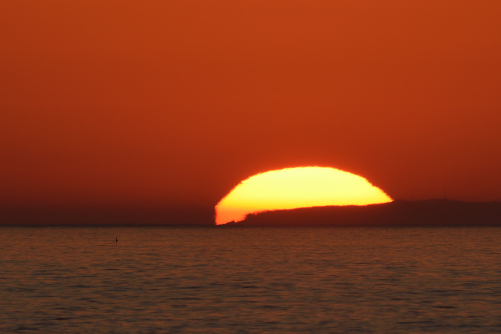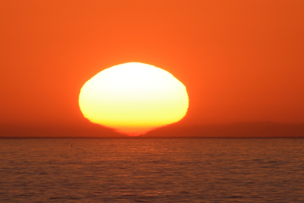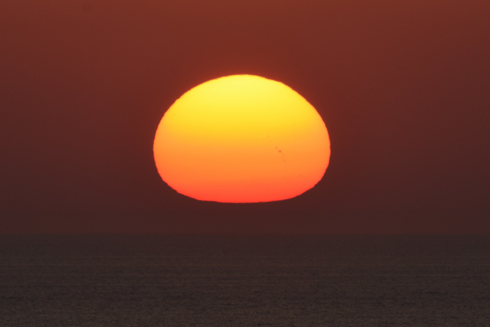 Le principal obstacle à l'observation du coucher du Soleil sur l'océan est le Mont Sollube derrière lequel le Soleil disparaît pendant la première moitié du mois d'octobre. Mais lors de l'observation présentée ici, après avoir subi un aplatissement très important et une forte asymétrie (15.1), une partie du Soleil a disparu derrière l'océan (15.4) ce qui a permis de distinguer une deuxième image (15.2), à gauche de la crête sud du Mont Sollube (qui est entièrement visible dans 15.5). Une bande d'absorption accompagne le phénomène.
