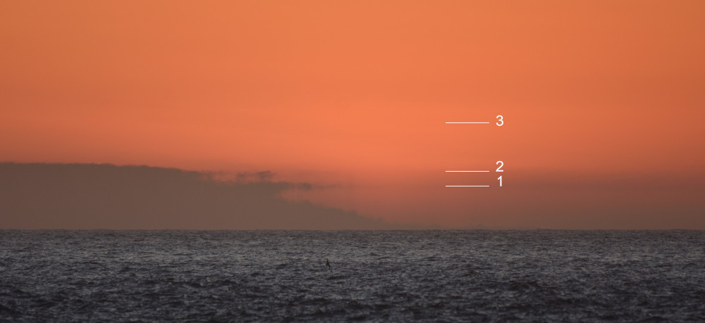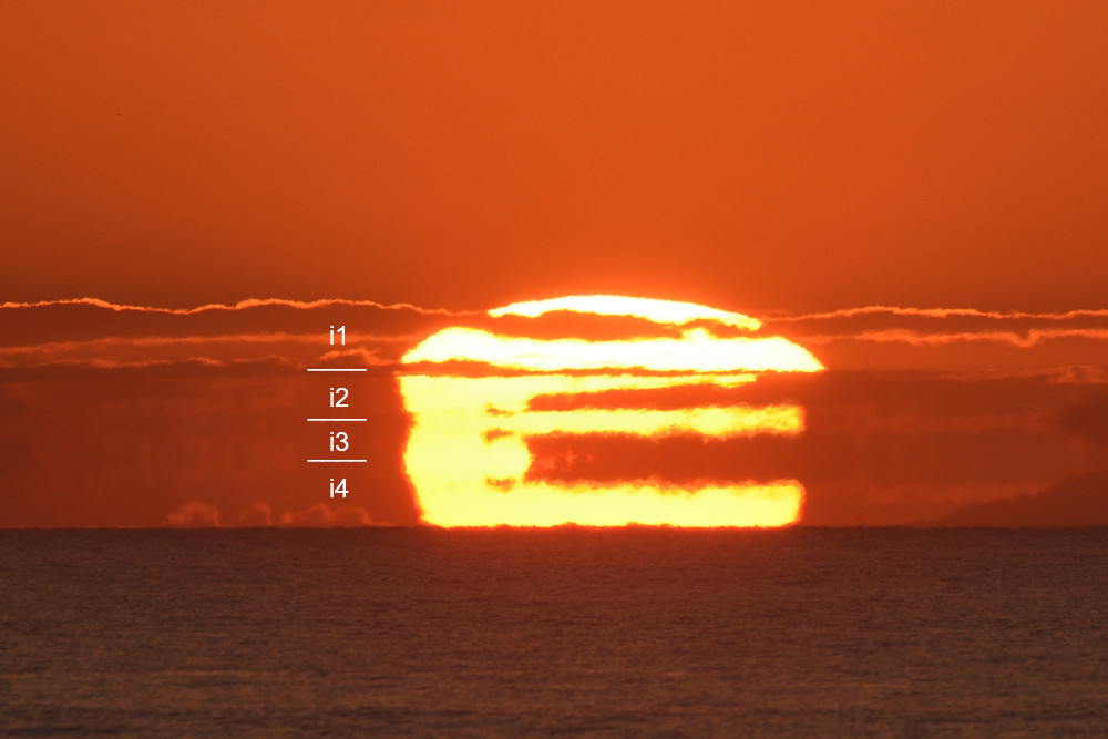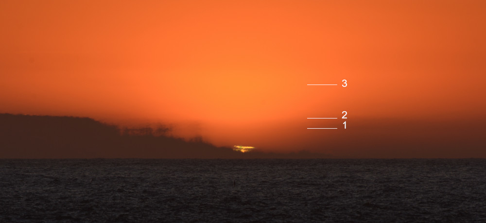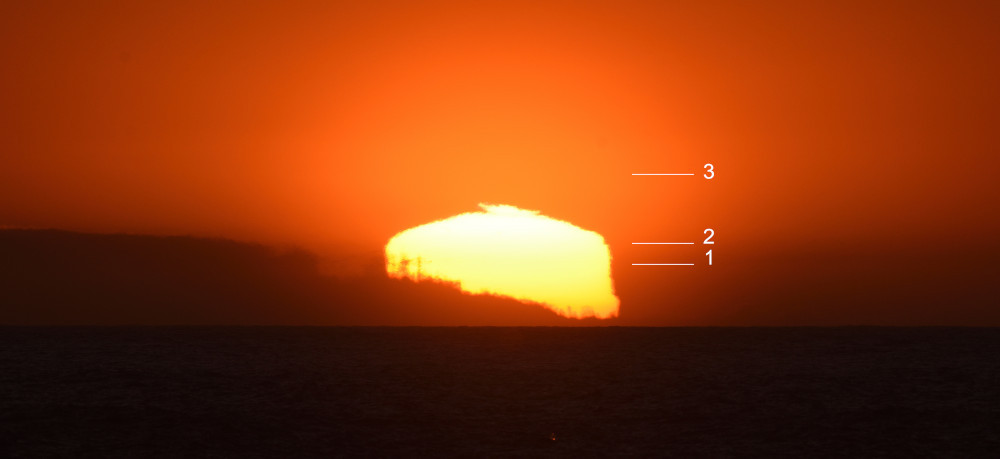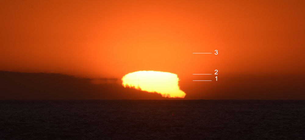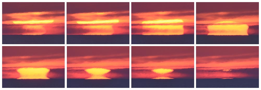 Les images 8.1 à 8.10 présentent chronologiquement la situation au fur et à mesure de la descente du Soleil au-dessus de l'Océan Atlantique. La luminosité de chaque photographie a été ajustée afin de mettre en évidence des éléments propres à chaque situation ; les images ont été centrées horizontalement sur le Soleil (alors qu'il se déplace vers la droite) et alignées verticalement sur le niveau de l'océan. Les lignes notées 1, 2 et 3 correspondent à trois niveaux dans l'atmosphère où l'indice de réfraction varie de façon abrupte et provoque des effets spectaculaires de mirage.