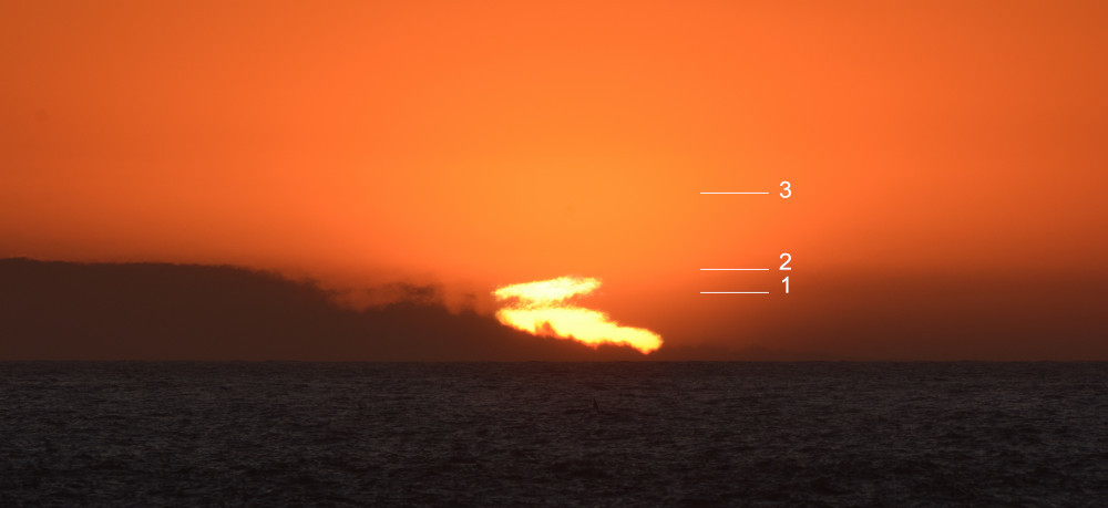 Le lendemain de l'observation n° 2, depuis Le Barcarès (Pyrénées-Orientales), le lever du Soleil a commencé par la même fine ligne horizontale (3.1) et s'est terminé au contraire par un étirement vertical vers le bas (3.10) après avoir montré de petits mirages en forme de décollement du limbe supérieur (3.4 et 3.5), un plateau (3.6) et une forme de champignon au pied très large (3.9) aussi observé en d'autres circonstances (cf. la page sur la réfraction appliquée au Soleil). Comme dans l'observation n° 1, les images ont été alignées sur le Soleil ce qui donne l'impression que les nuages se déplacent vers la gauche alors que c'est le Soleil qui va vers la droite. Les photographies ont été effectuées au bord de la mer.