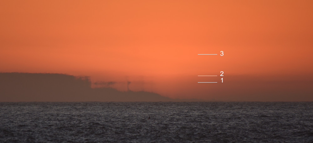 Quatre heures plus tard, un mirage supérieur pour l'extrémité orientale de la chaîne des Pyrénées a été observé depuis Le Barcarès dans les Pyrénées-Orientales (cf. page sur les mirages supérieurs observés au-dessus de l'eau).