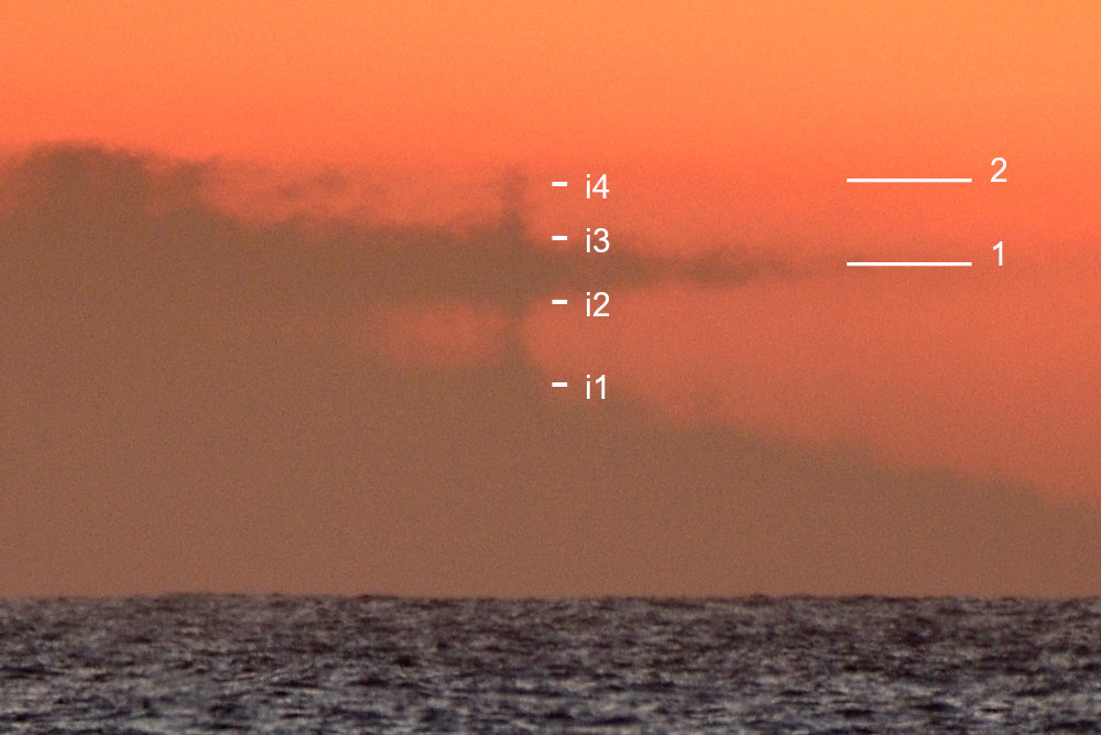 Les lignes horizontales observées à la fin de l'événement, quatre dans le premier cas et trois dans le second, sont à rapprocher d'un mirage étudié et reproduit par Siebren van der Werf dans son article "Novaya Zemlya effect and Fata Morgana. Raytracing in a spherically non-symmetric atmosphere"1. Une quarantaine d'années auparavant, dans un article intitulé "The Novaya Zemlya effect : An arctic mirage"2, Waldemar H. Lehn avait noté que, dans un mirage de type "Novaya Zemlya", le Soleil pouvait apparaître sous la forme de deux ou trois bandes horizontales. Une observation et une modélisation de ce type de mirage a été effectuée peu après par W. H. Lehn et B. A. German dans leur article "Novaya Zemlya effect : analysis of an observation"3. Enfin, une description de ce type de mirage est aussi donnée dans un autre article, signé par Siebren Y. van der Werf, Günther P. Können et Waldemar H. Lehn : "l'image du Soleil peut être rectangulaire et peut être scindée en plusieurs morceaux horizontaux" ("Novaya Zemlya effect and sunsets4), ce qui correspond assez bien à la fin des phénomènes observés lors de ces deux couchers de Soleil de mai 2023.
