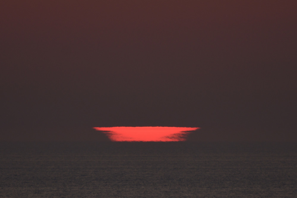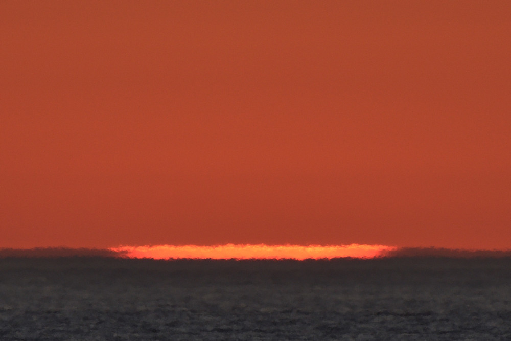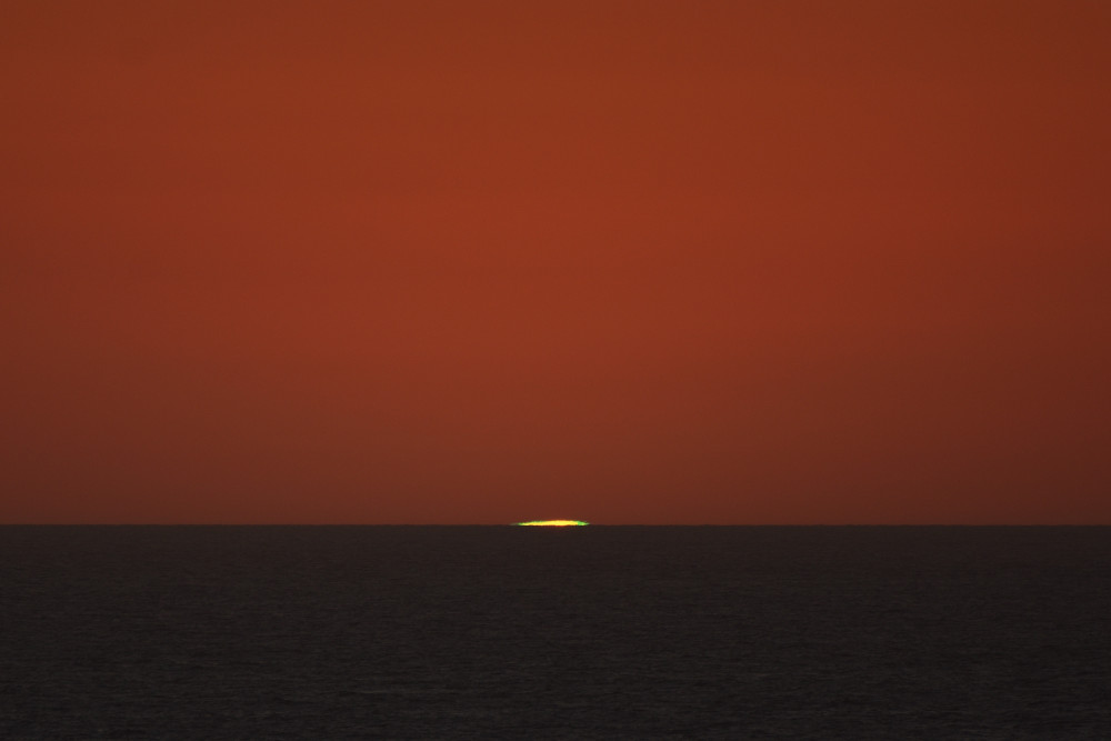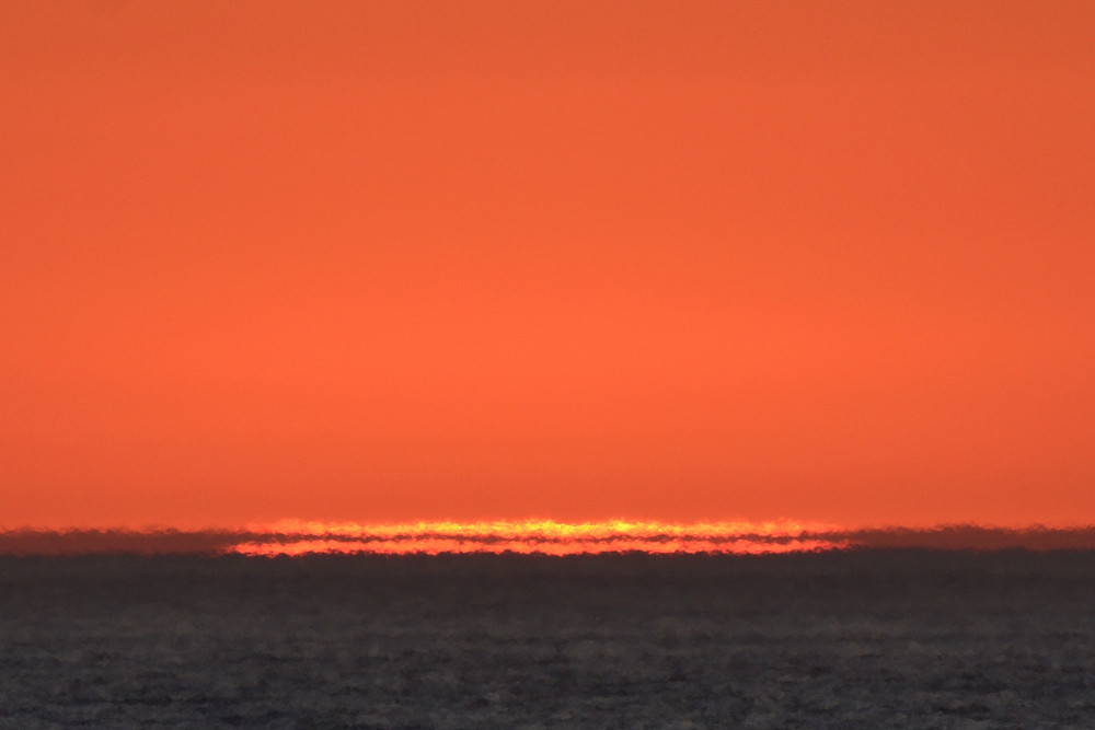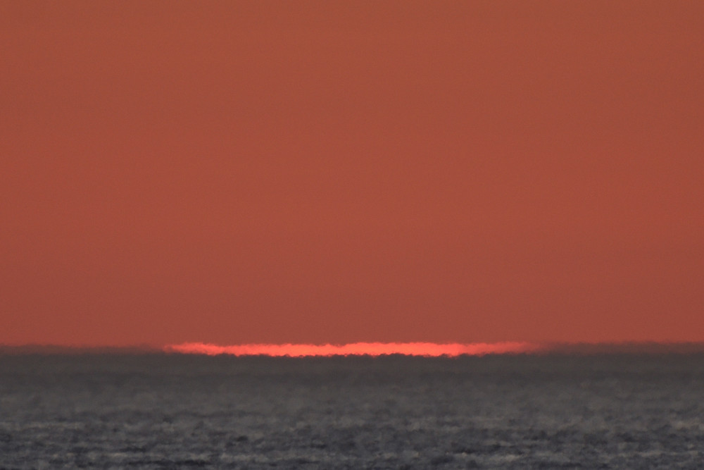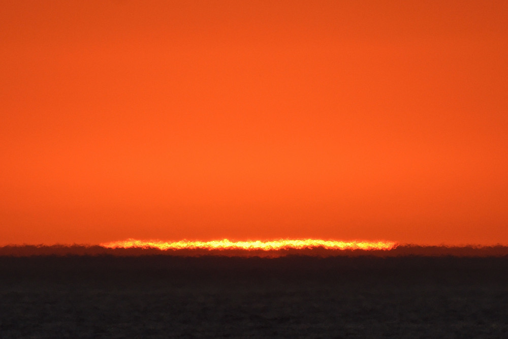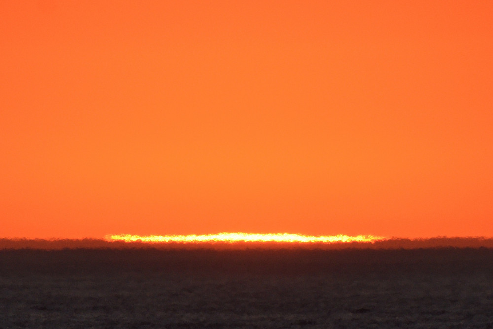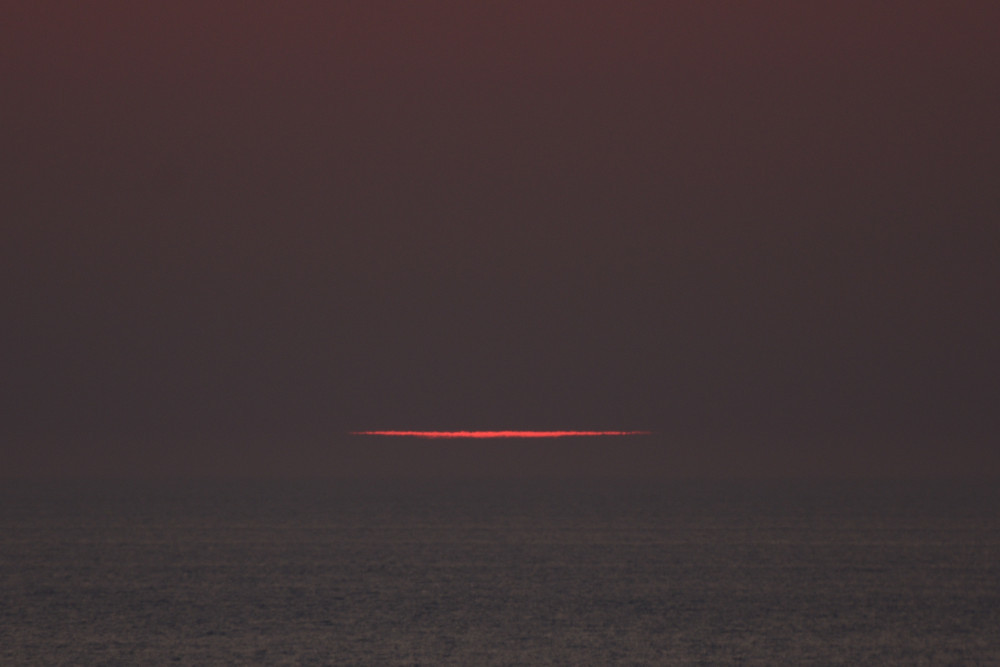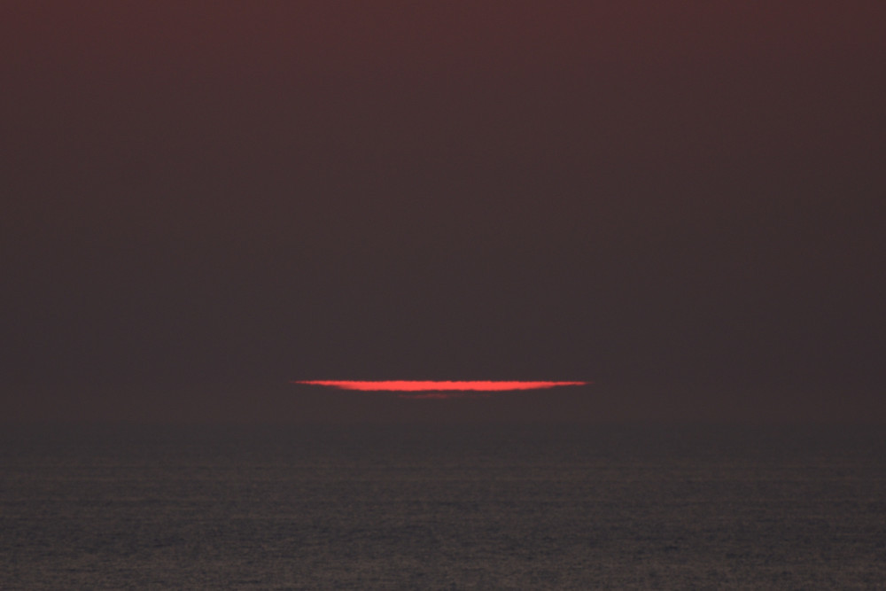 Dans ses derniers instants, notre étoile affiche une forme qui n'a rien de commun avec un coucher habituel : en 6.2, ses deux extrémités sont relevées et, en 6.3 et 6.4, il est réduit à un simple trait horizontal. Il est absent de la dernière image (6.5) mais une ligne horizontale très brillante apparaît juste au-dessus de l'horizon marin. Cette ligne était déjà présente dans les images précédentes et, dans l'image 6.6, qui est un agrandissement de 6.5, une structure plus fine est discernable par la présence d'une ligne horizontale sombre qui la sépare en deux parties sur toute sa longueur. Peut-être s'agit-il du même effet de la réfraction qui s'appliquerait à un groupe de nuages situés très en-dessous de l'horizon marin et dont l'image, comme pour le Soleil, serait très surélevée et réduite à une ligne horizontale.