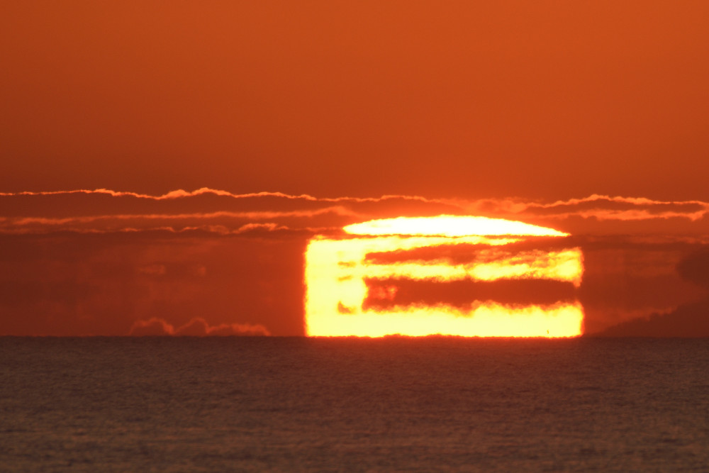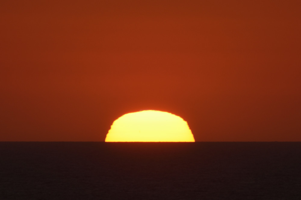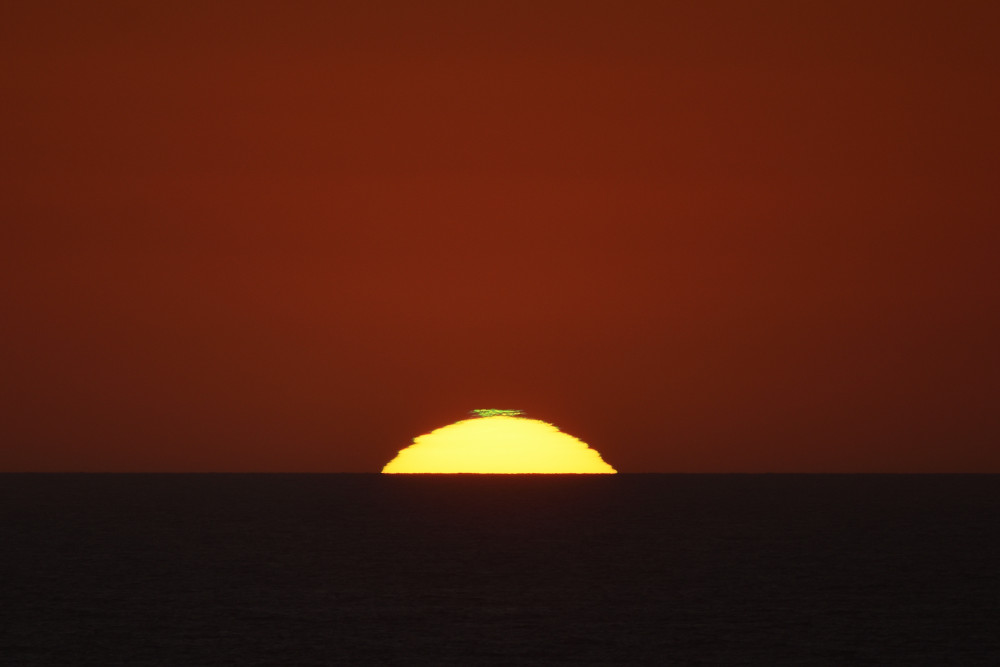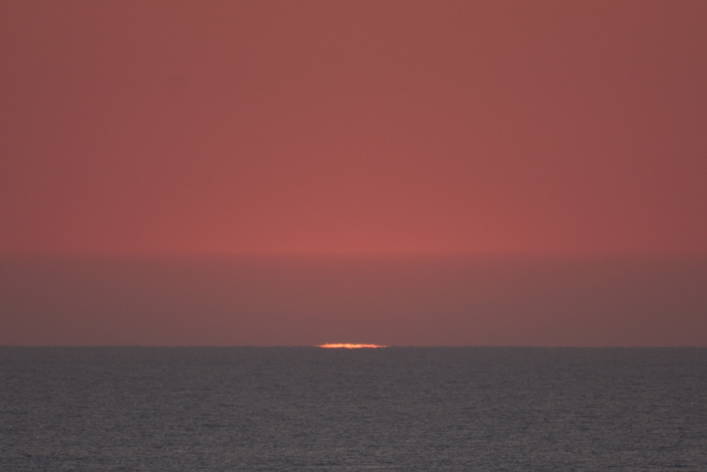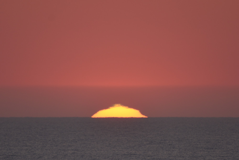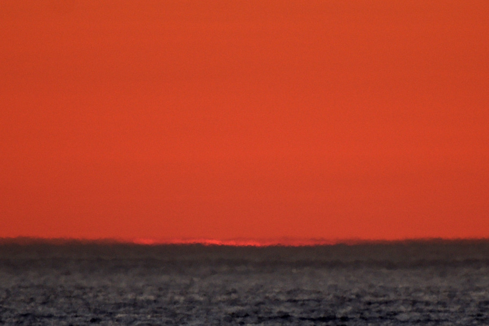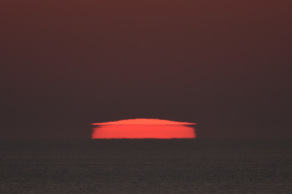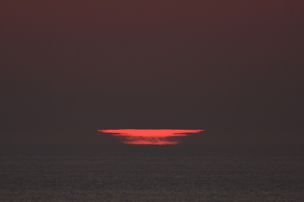 Dans ses derniers instants, notre étoile affiche une forme qui n'a rien de commun avec un coucher habituel : en 6.2, ses deux extrémités sont relevées et, en 6.3 et 6.4, il est réduit à un simple trait horizontal. Il est absent de la dernière image (6.5) mais une ligne horizontale très brillante apparaît juste au-dessus de l'horizon marin. Cette ligne était déjà présente dans les images précédentes et, dans l'image 6.6, qui est un agrandissement de 6.5, une structure plus fine est discernable par la présence d'une ligne horizontale sombre qui la sépare en deux parties sur toute sa longueur. Peut-être s'agit-il du même effet de la réfraction qui s'appliquerait à un groupe de nuages situés très en-dessous de l'horizon marin et dont l'image, comme pour le Soleil, serait très surélevée et réduite à une ligne horizontale.