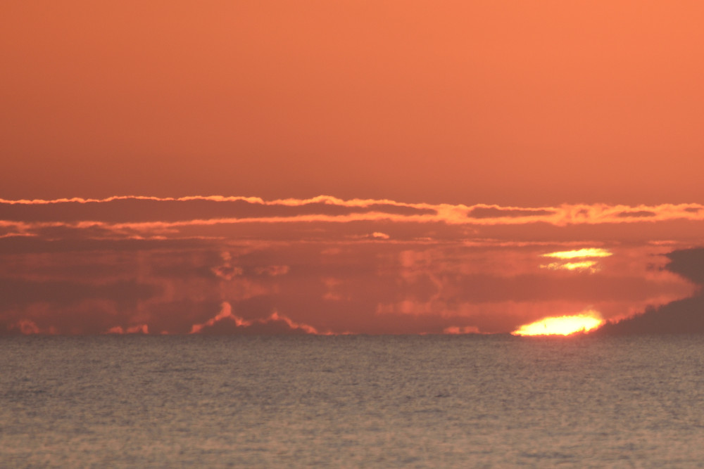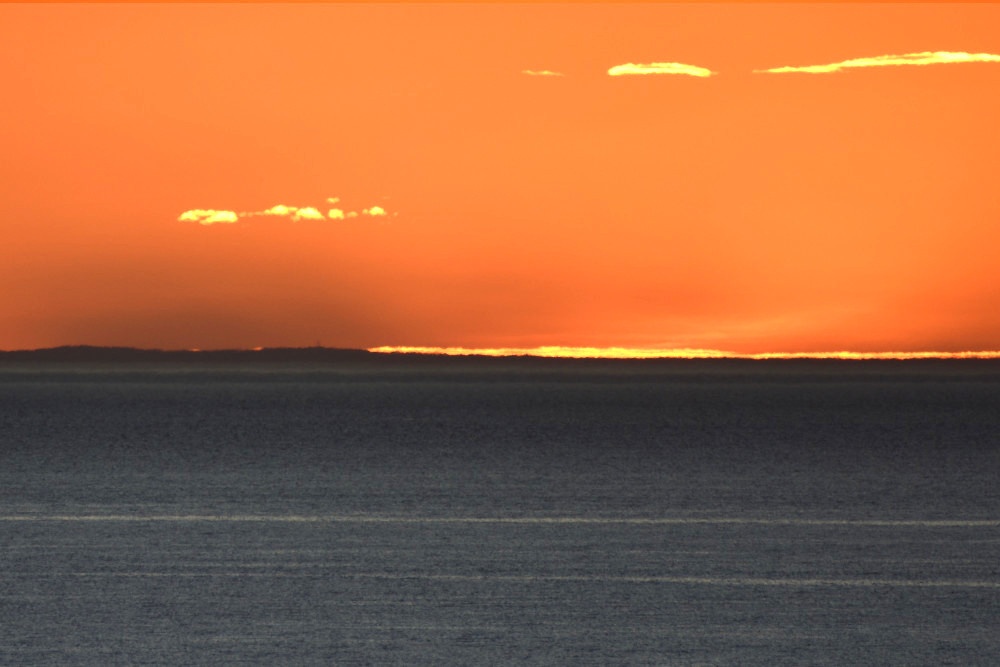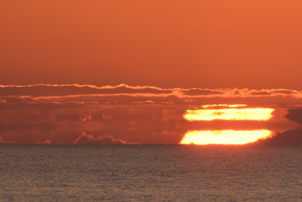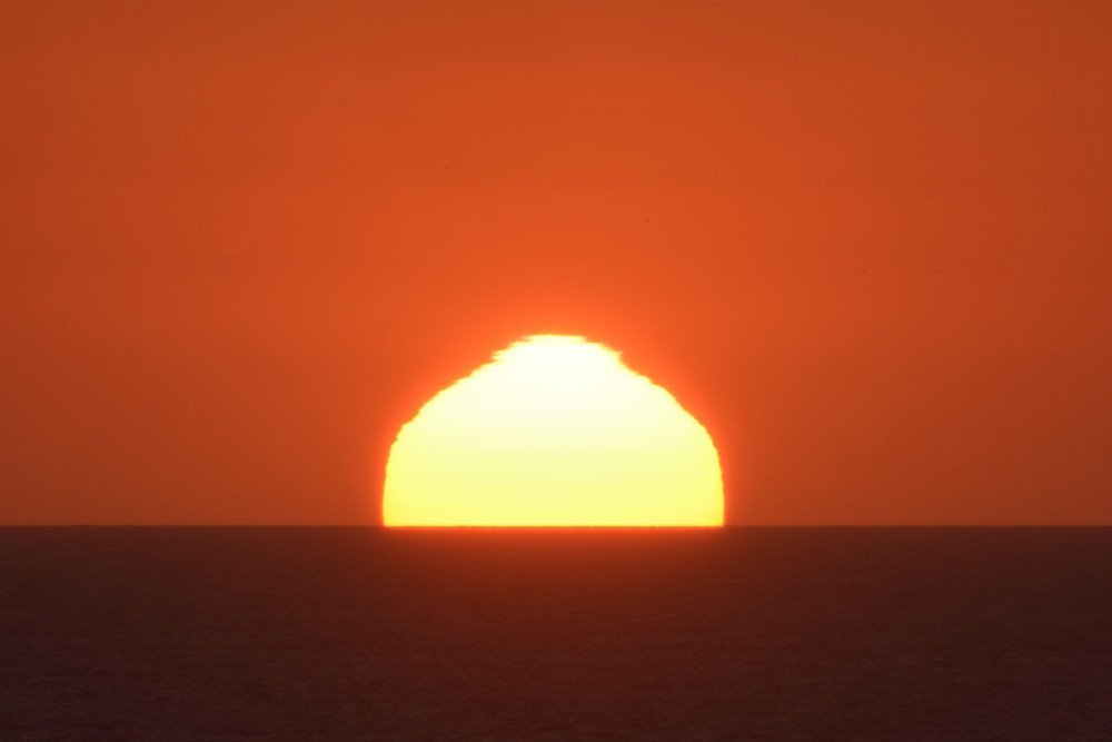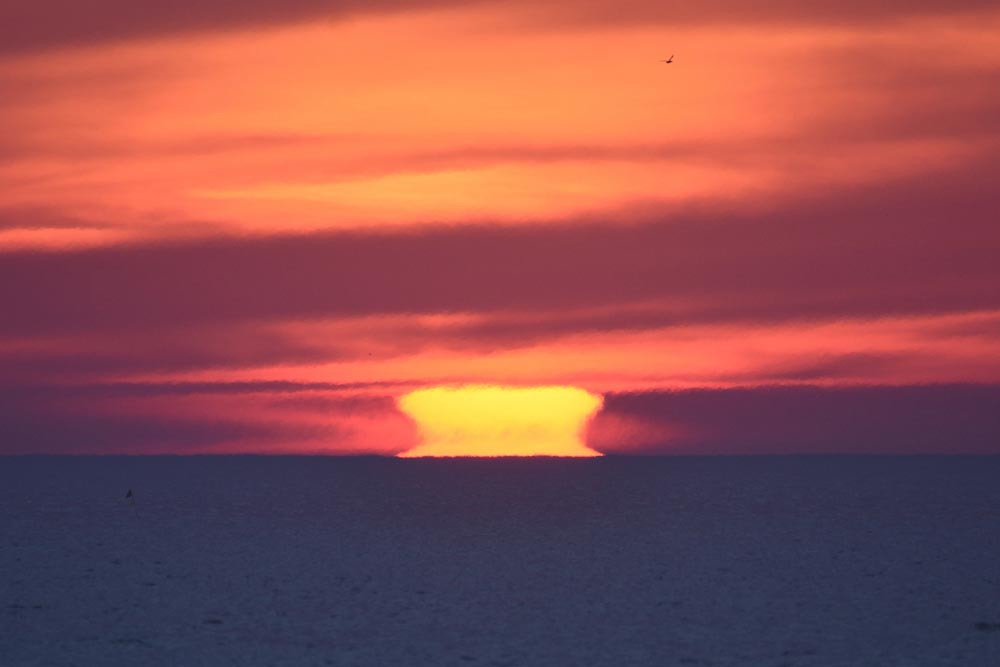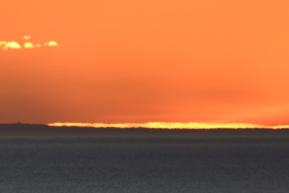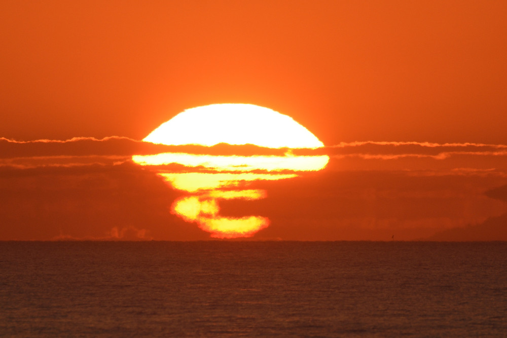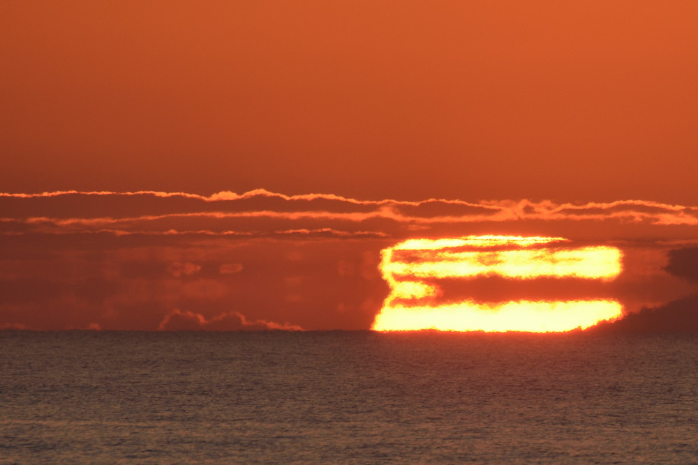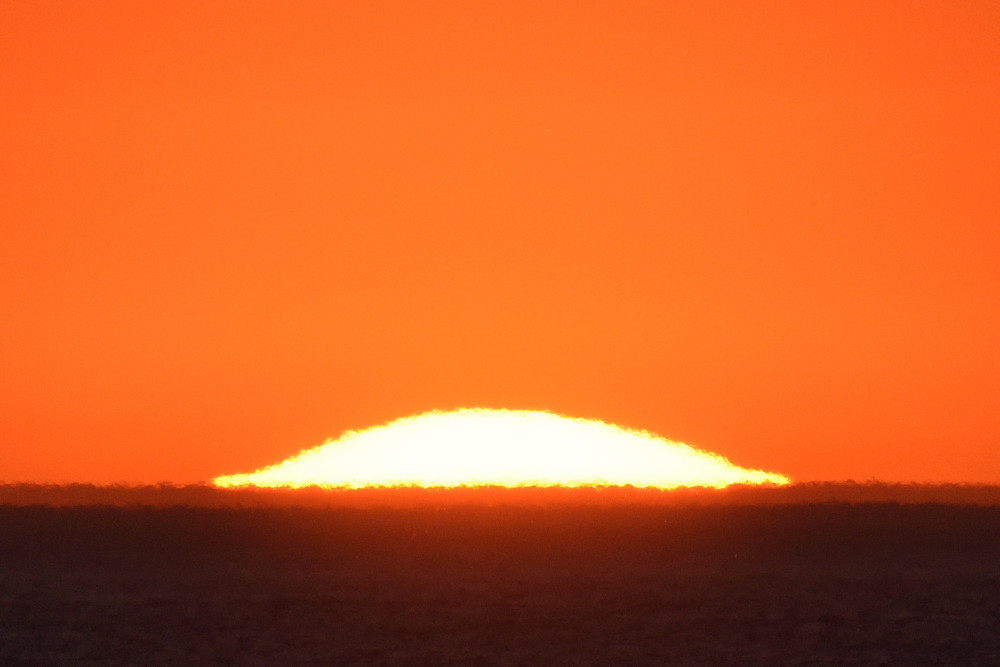 Dans ses derniers instants, notre étoile affiche une forme qui n'a rien de commun avec un coucher habituel : en 6.2, ses deux extrémités sont relevées et, en 6.3 et 6.4, il est réduit à un simple trait horizontal. Il est absent de la dernière image (6.5) mais une ligne horizontale très brillante apparaît juste au-dessus de l'horizon marin. Cette ligne était déjà présente dans les images précédentes et, dans l'image 6.6, qui est un agrandissement de 6.5, une structure plus fine est discernable par la présence d'une ligne horizontale sombre qui la sépare en deux parties sur toute sa longueur. Peut-être s'agit-il du même effet de la réfraction qui s'appliquerait à un groupe de nuages situés très en-dessous de l'horizon marin et dont l'image, comme pour le Soleil, serait très surélevée et réduite à une ligne horizontale.