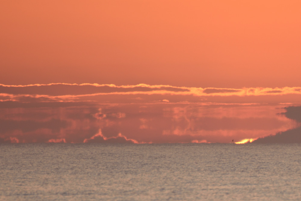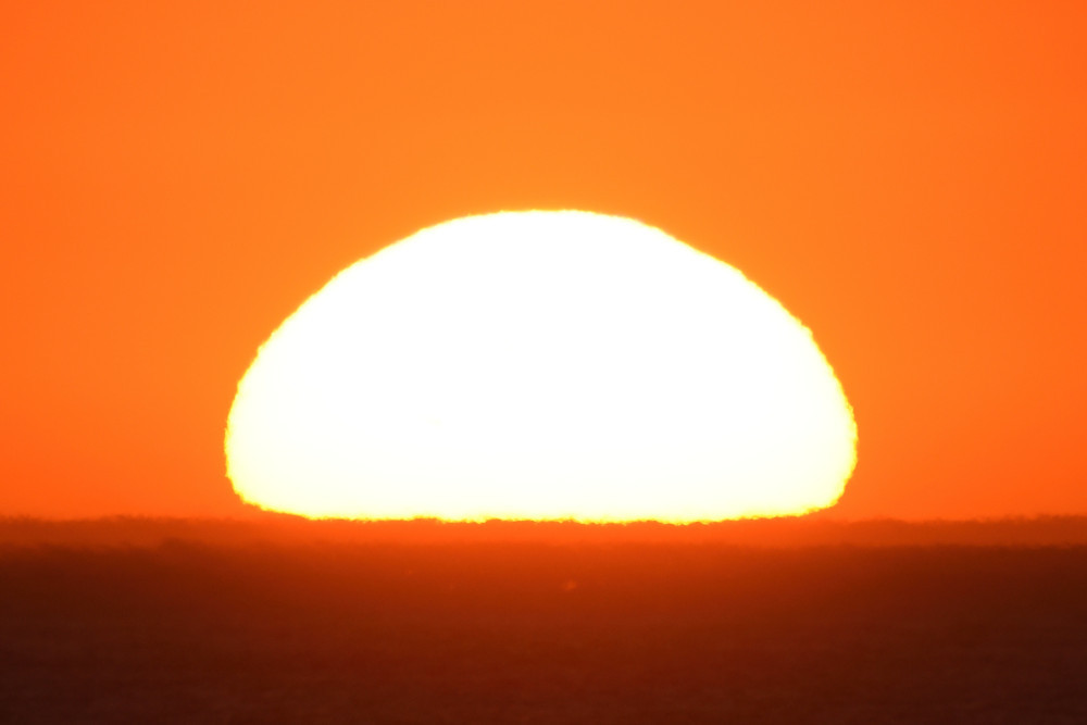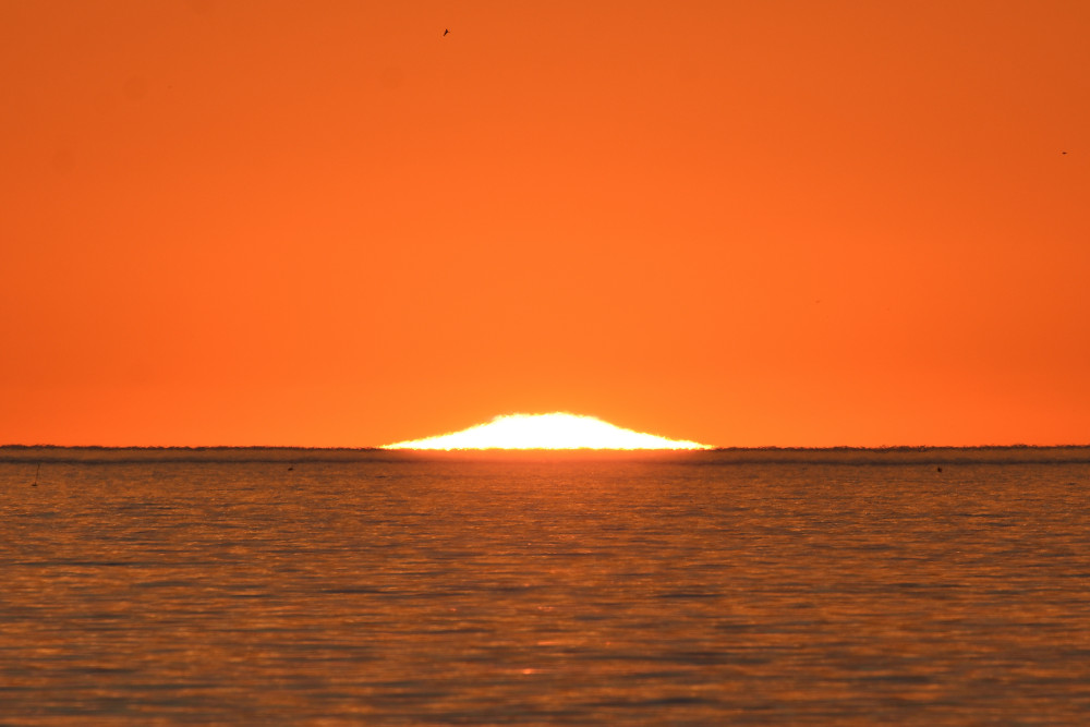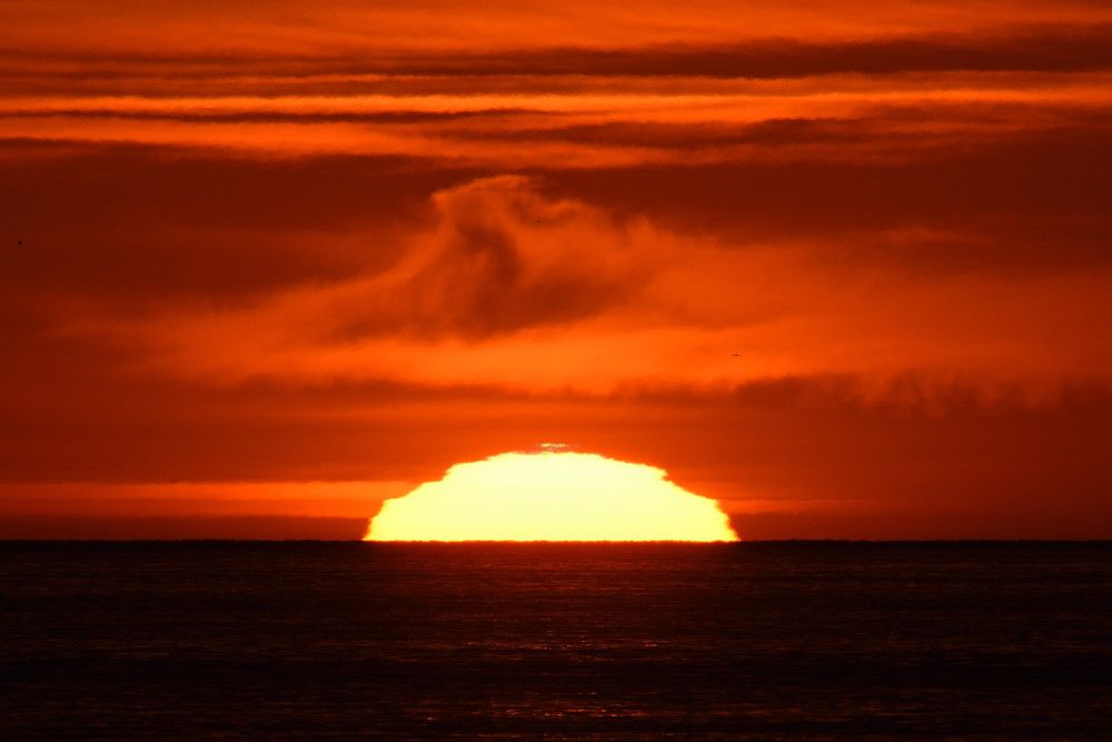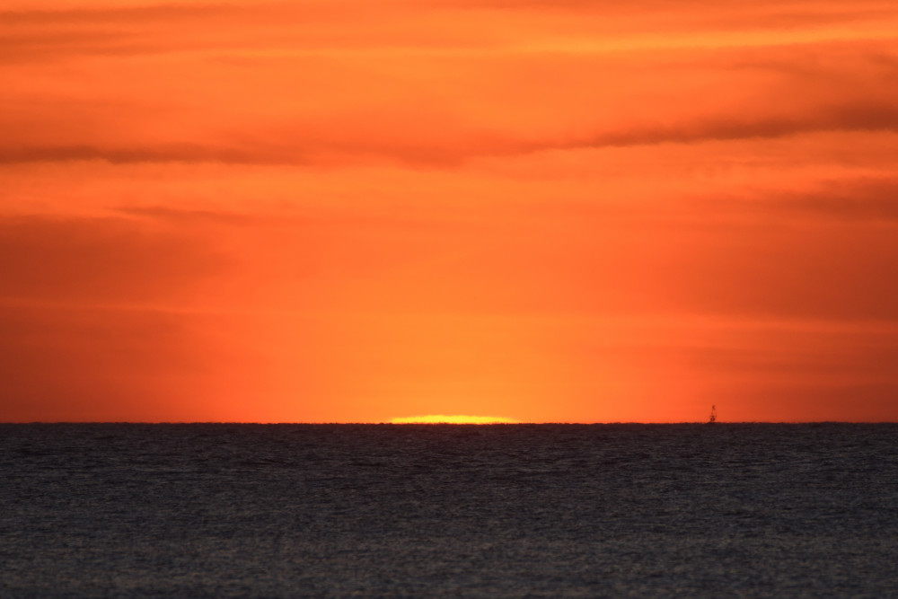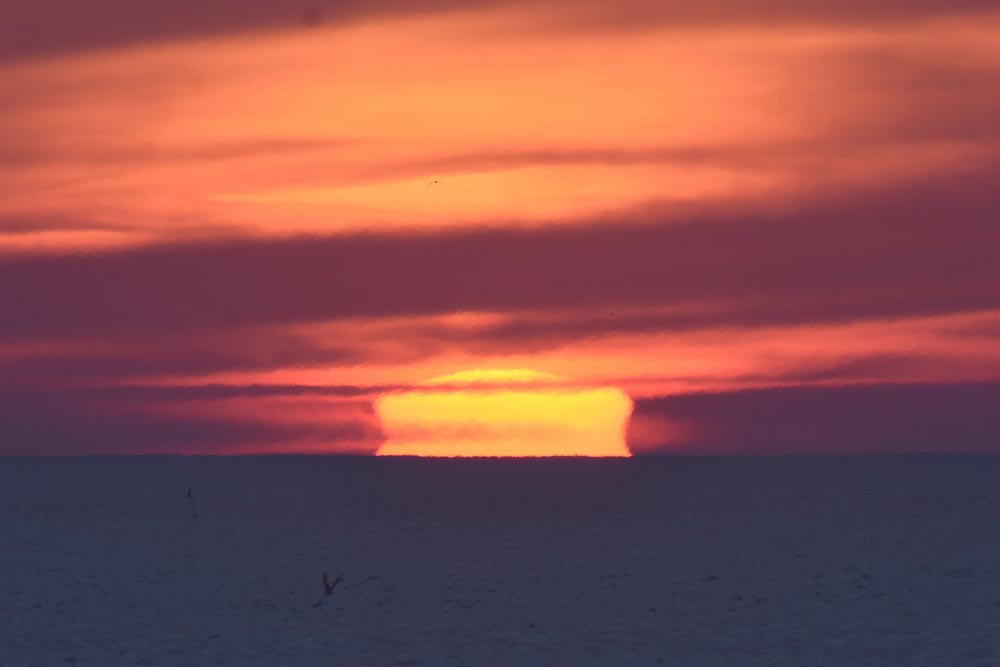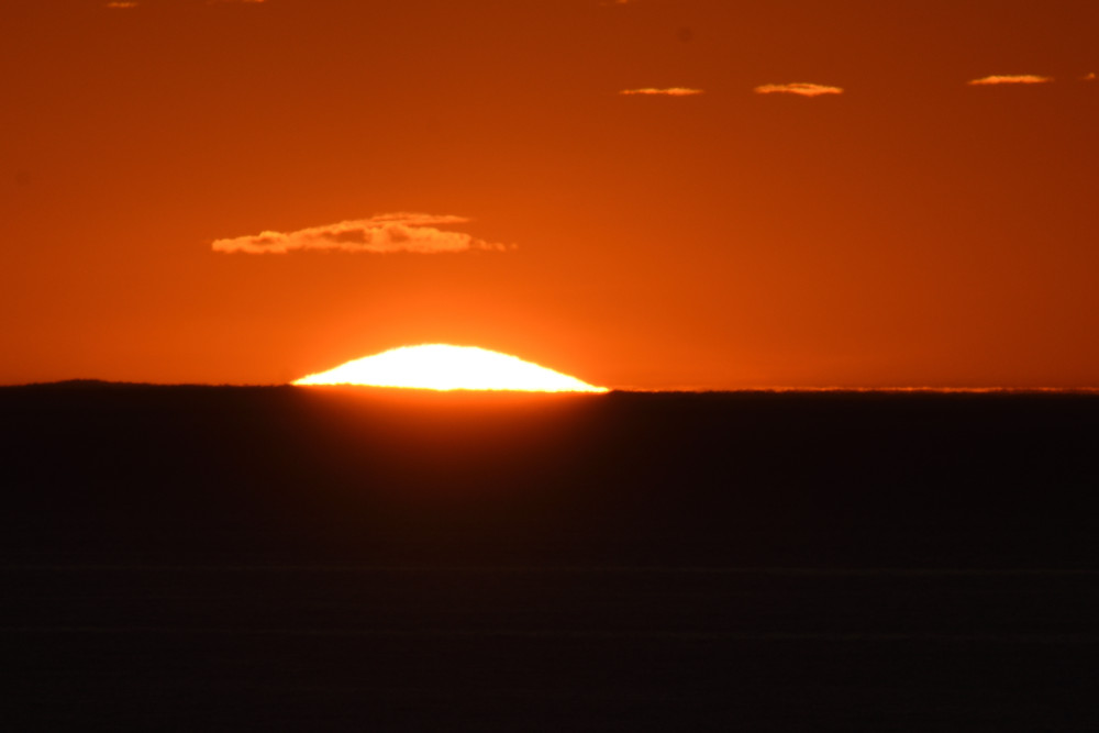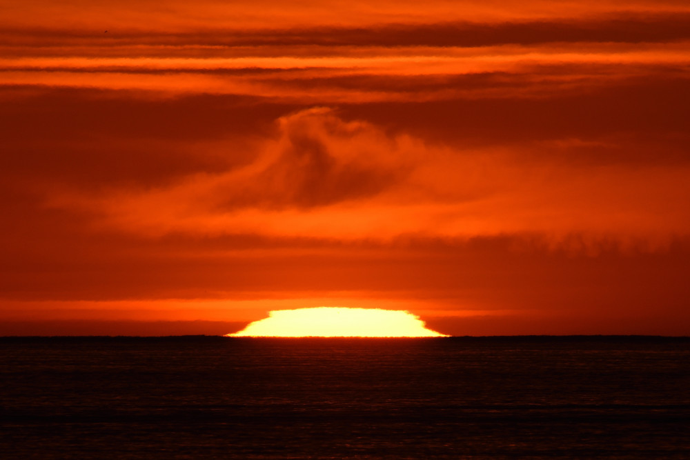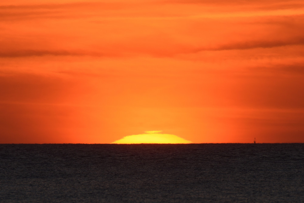 Dans ses derniers instants, notre étoile affiche une forme qui n'a rien de commun avec un coucher habituel : en 6.2, ses deux extrémités sont relevées et, en 6.3 et 6.4, il est réduit à un simple trait horizontal. Il est absent de la dernière image (6.5) mais une ligne horizontale très brillante apparaît juste au-dessus de l'horizon marin. Cette ligne était déjà présente dans les images précédentes et, dans l'image 6.6, qui est un agrandissement de 6.5, une structure plus fine est discernable par la présence d'une ligne horizontale sombre qui la sépare en deux parties sur toute sa longueur. Peut-être s'agit-il du même effet de la réfraction qui s'appliquerait à un groupe de nuages situés très en-dessous de l'horizon marin et dont l'image, comme pour le Soleil, serait très surélevée et réduite à une ligne horizontale.