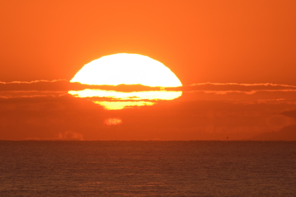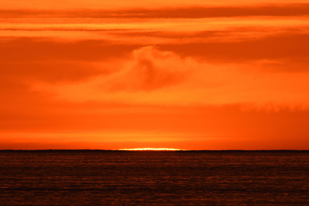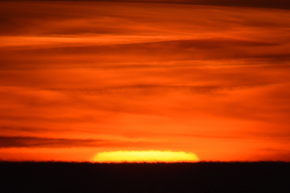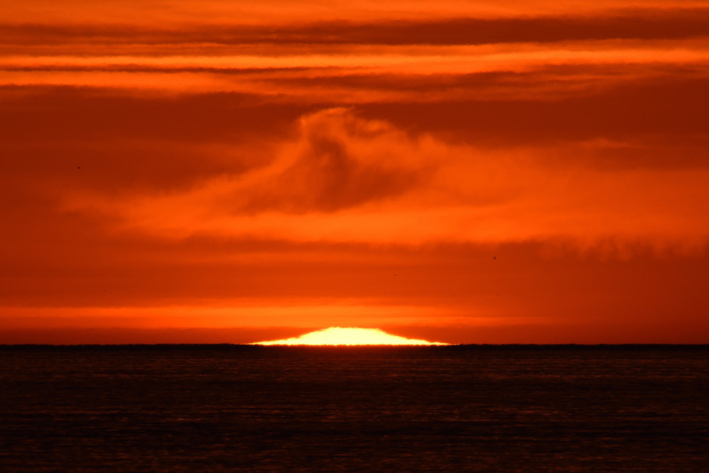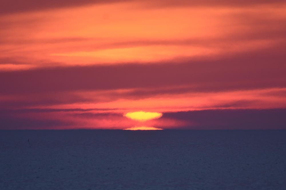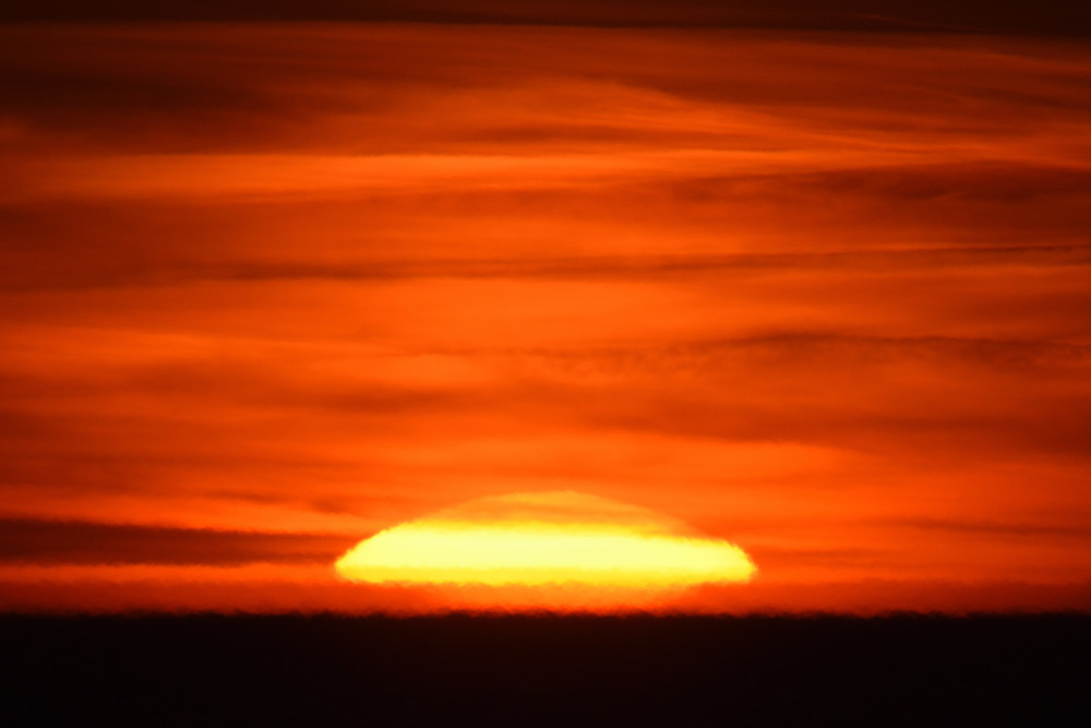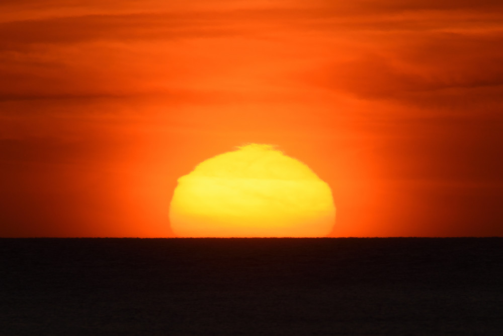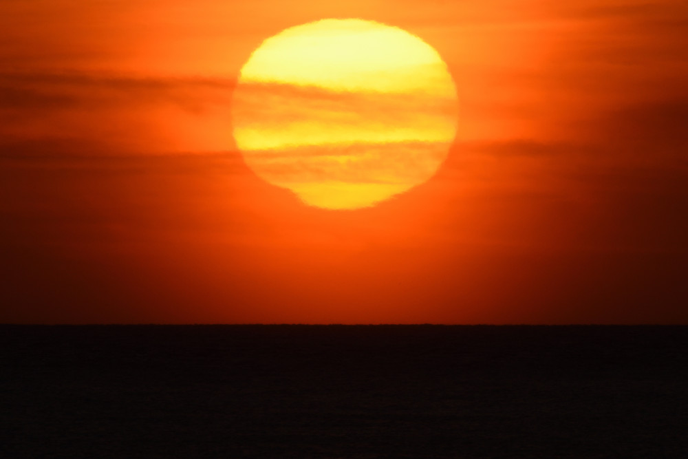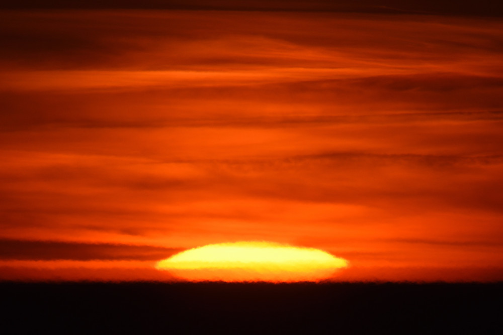 Dans ses derniers instants, notre étoile affiche une forme qui n'a rien de commun avec un coucher habituel : en 6.2, ses deux extrémités sont relevées et, en 6.3 et 6.4, il est réduit à un simple trait horizontal. Il est absent de la dernière image (6.5) mais une ligne horizontale très brillante apparaît juste au-dessus de l'horizon marin. Cette ligne était déjà présente dans les images précédentes et, dans l'image 6.6, qui est un agrandissement de 6.5, une structure plus fine est discernable par la présence d'une ligne horizontale sombre qui la sépare en deux parties sur toute sa longueur. Peut-être s'agit-il du même effet de la réfraction qui s'appliquerait à un groupe de nuages situés très en-dessous de l'horizon marin et dont l'image, comme pour le Soleil, serait très surélevée et réduite à une ligne horizontale.