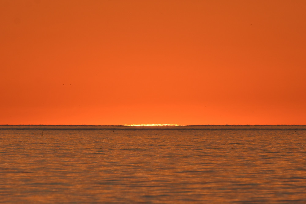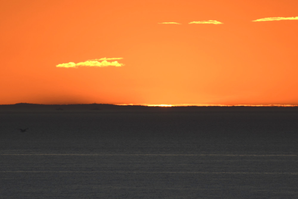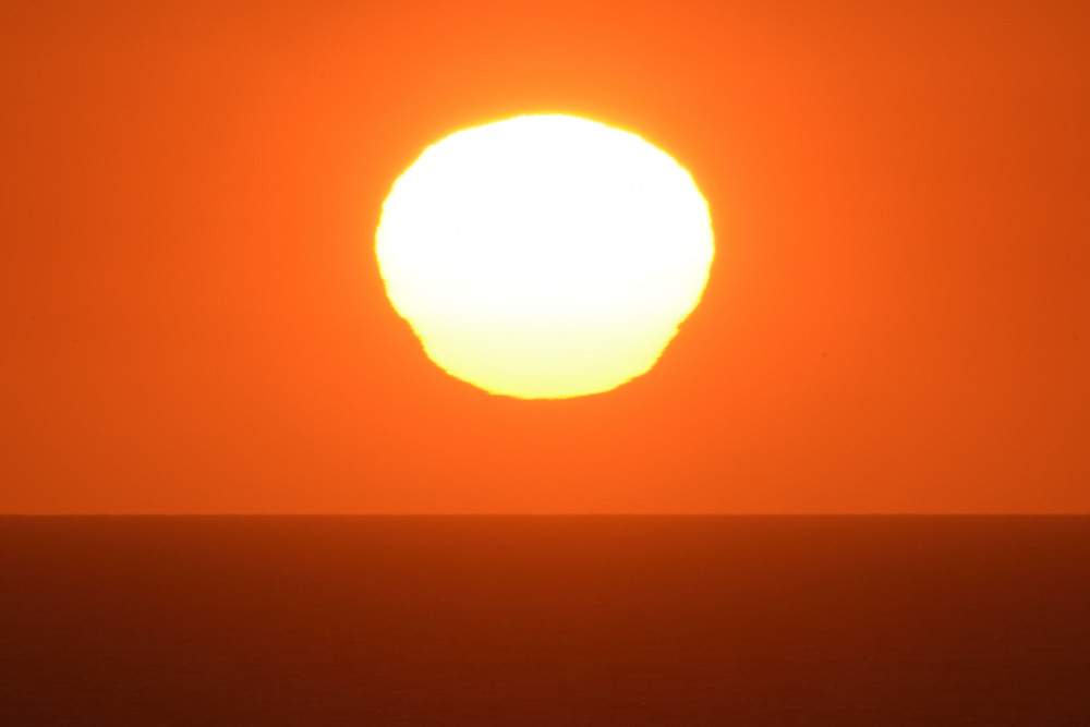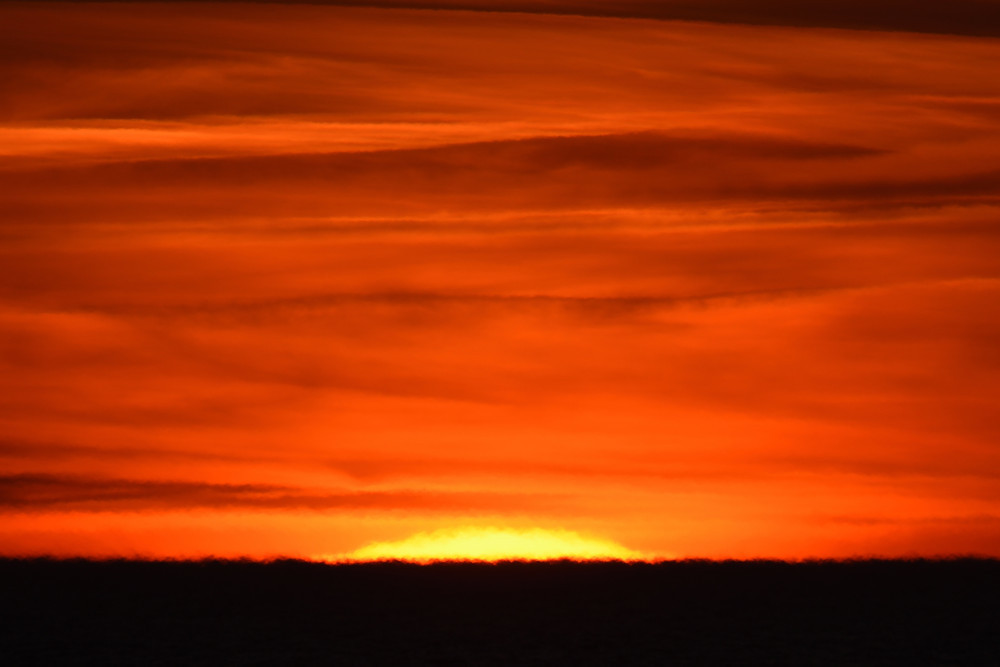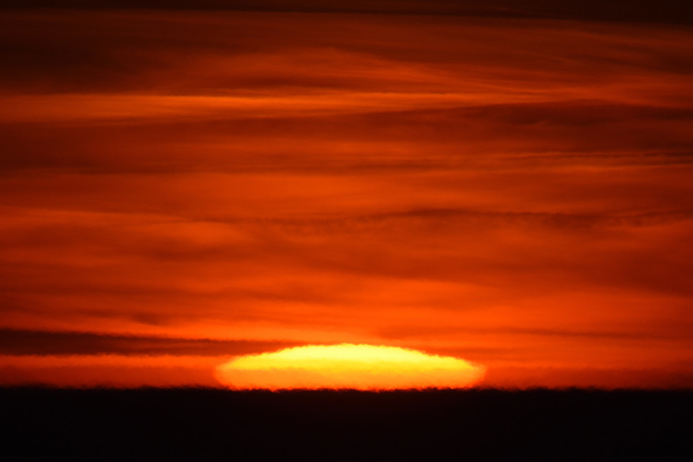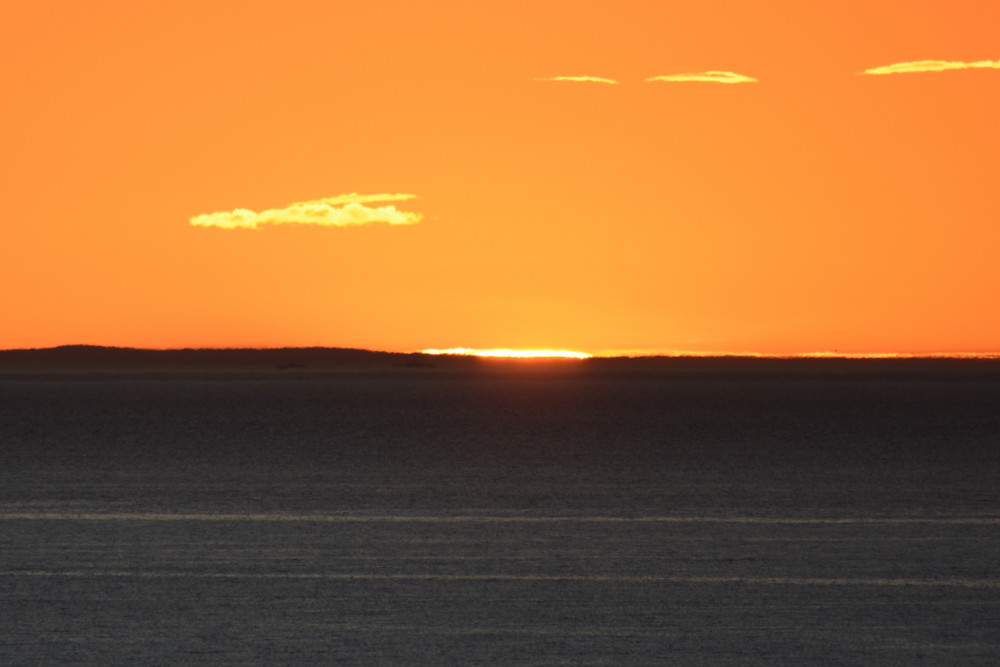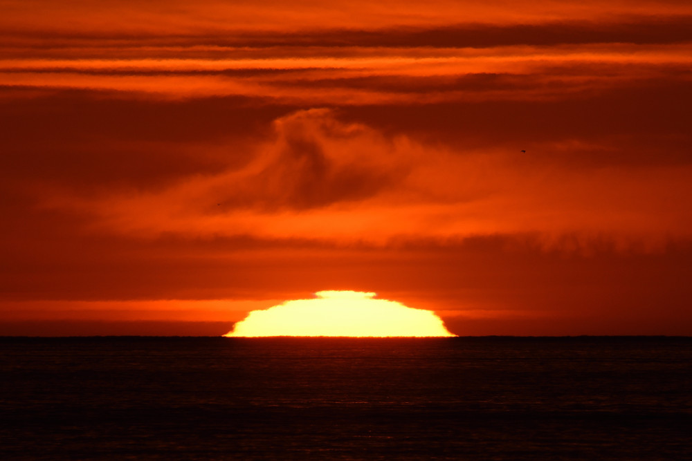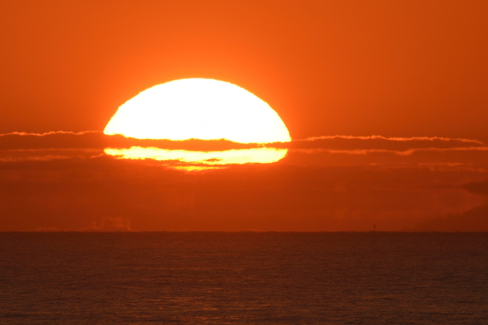 Dans ses derniers instants, notre étoile affiche une forme qui n'a rien de commun avec un coucher habituel : en 6.2, ses deux extrémités sont relevées et, en 6.3 et 6.4, il est réduit à un simple trait horizontal. Il est absent de la dernière image (6.5) mais une ligne horizontale très brillante apparaît juste au-dessus de l'horizon marin. Cette ligne était déjà présente dans les images précédentes et, dans l'image 6.6, qui est un agrandissement de 6.5, une structure plus fine est discernable par la présence d'une ligne horizontale sombre qui la sépare en deux parties sur toute sa longueur. Peut-être s'agit-il du même effet de la réfraction qui s'appliquerait à un groupe de nuages situés très en-dessous de l'horizon marin et dont l'image, comme pour le Soleil, serait très surélevée et réduite à une ligne horizontale.