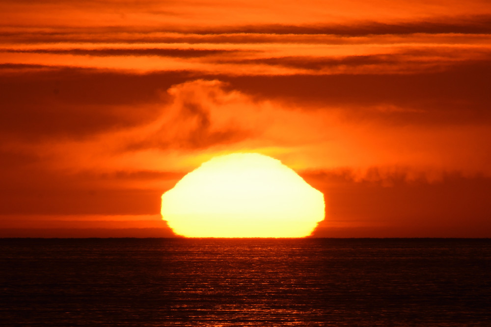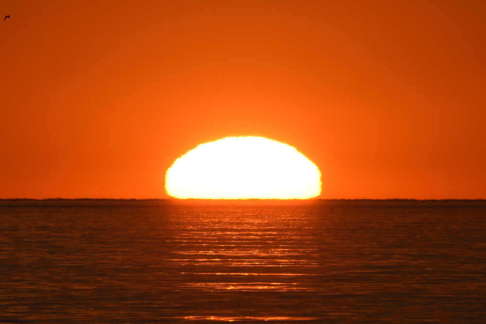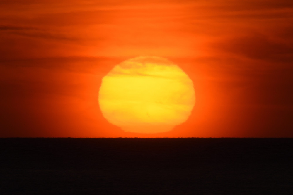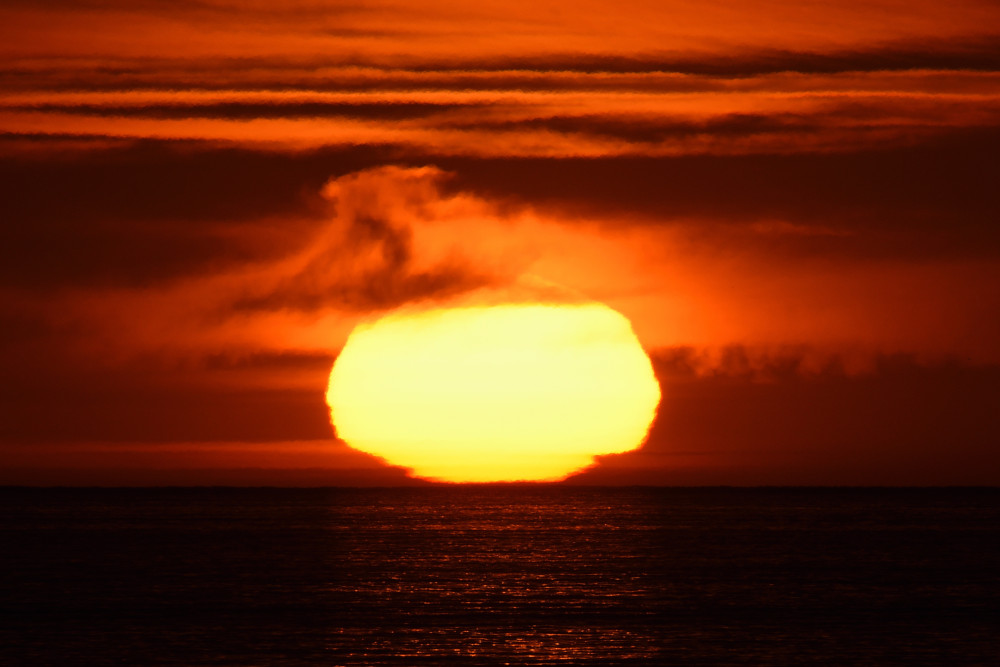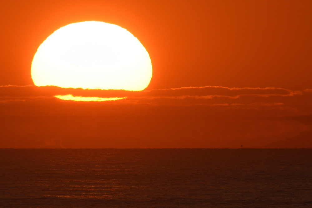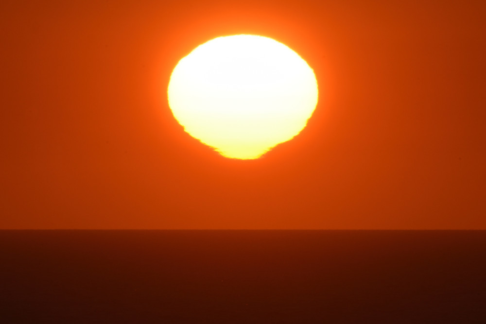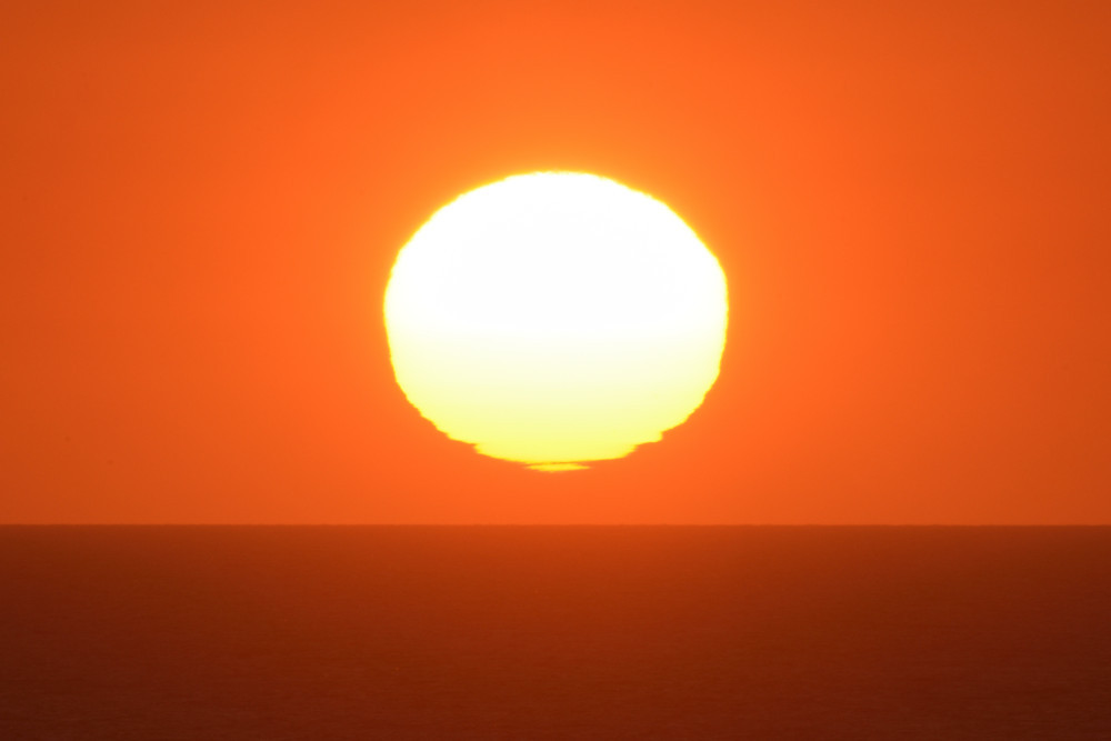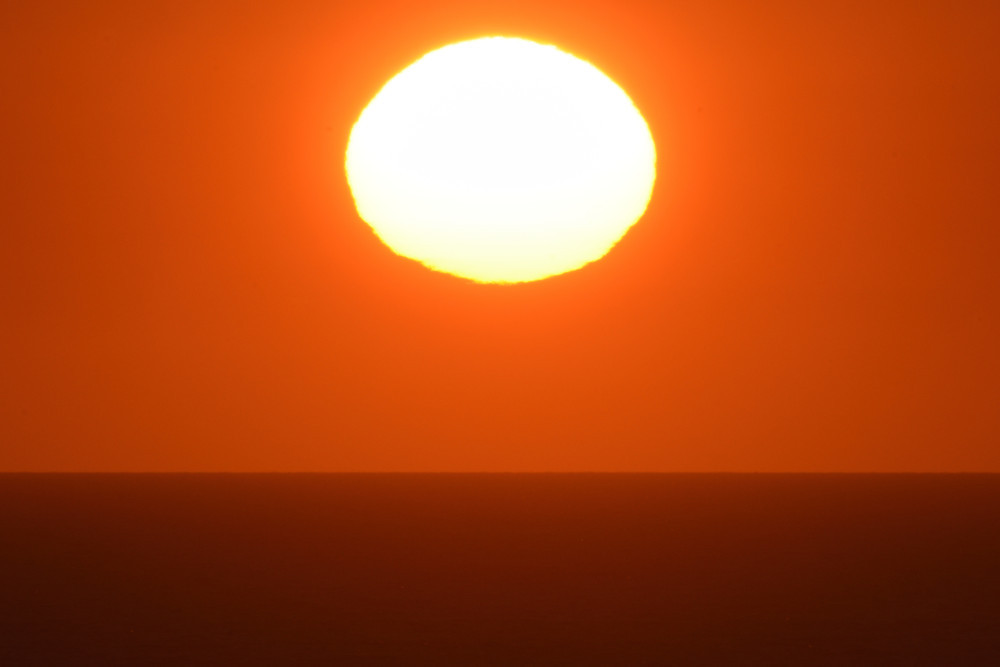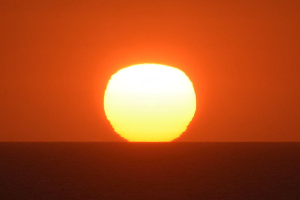 Dans ses derniers instants, notre étoile affiche une forme qui n'a rien de commun avec un coucher habituel : en 6.2, ses deux extrémités sont relevées et, en 6.3 et 6.4, il est réduit à un simple trait horizontal. Il est absent de la dernière image (6.5) mais une ligne horizontale très brillante apparaît juste au-dessus de l'horizon marin. Cette ligne était déjà présente dans les images précédentes et, dans l'image 6.6, qui est un agrandissement de 6.5, une structure plus fine est discernable par la présence d'une ligne horizontale sombre qui la sépare en deux parties sur toute sa longueur. Peut-être s'agit-il du même effet de la réfraction qui s'appliquerait à un groupe de nuages situés très en-dessous de l'horizon marin et dont l'image, comme pour le Soleil, serait très surélevée et réduite à une ligne horizontale.
