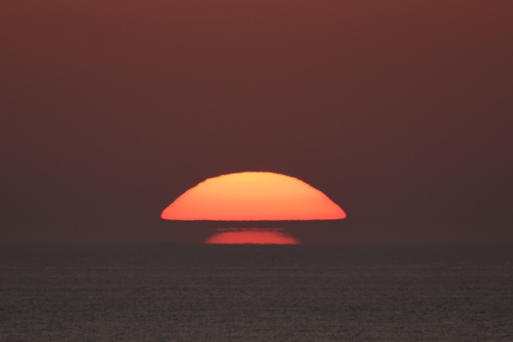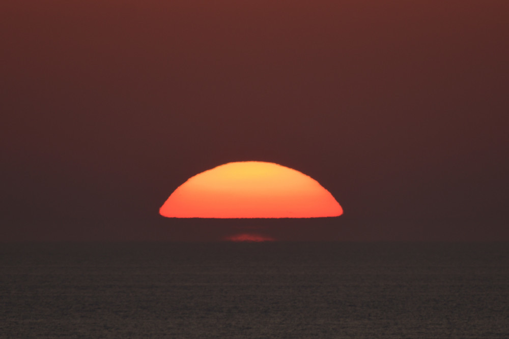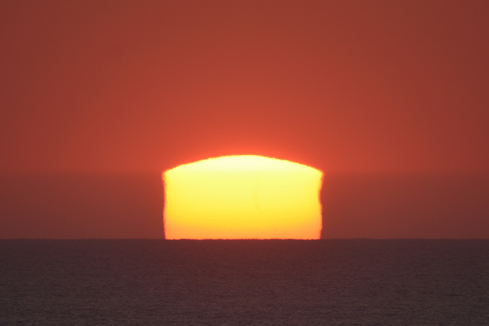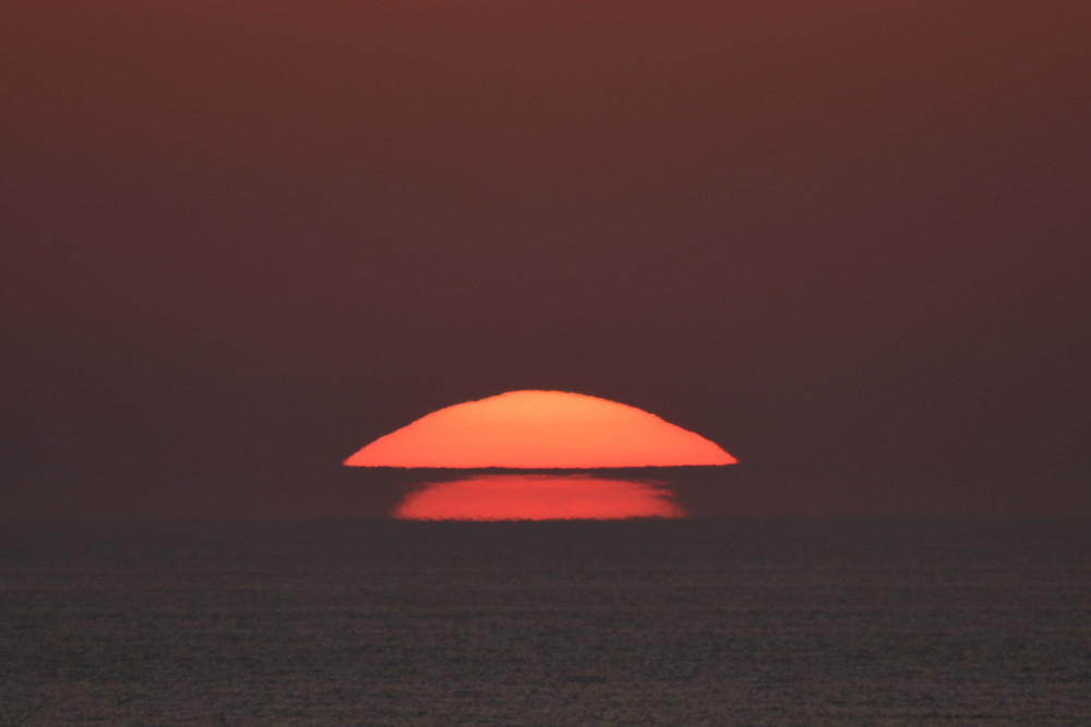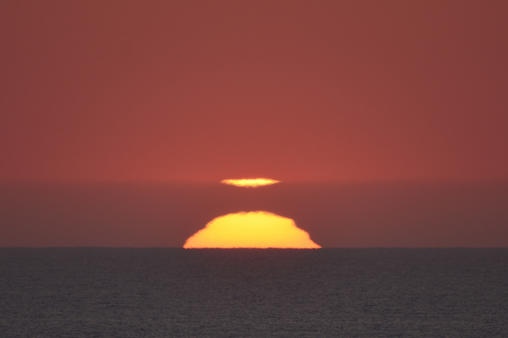 En mars 2022 à Biarritz, alors que le Soleil s'abaisse sur l'horizon, une image inversée et une image droite sont apparues sous lui (composition d'images 1.5). Le point d'observation est situé au bord de l'Océan Atlantique à une altitude d'environ 2 m. La visibilité de la séquence est un peu perturbée par la présence de bandes nuageuses mais l'évolution montre bien de haut en bas :
