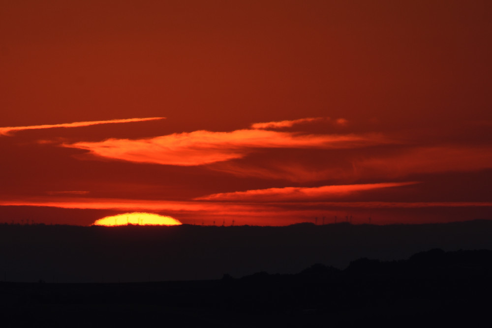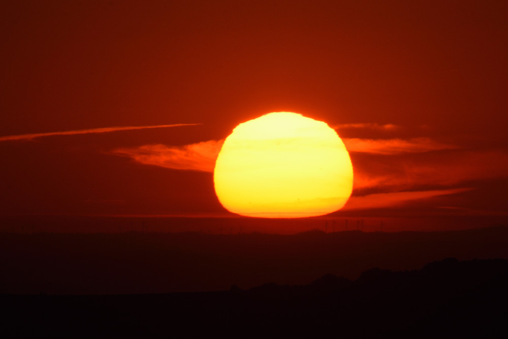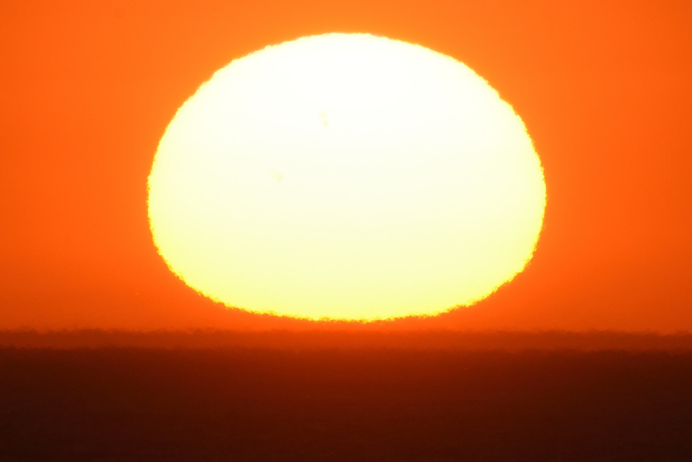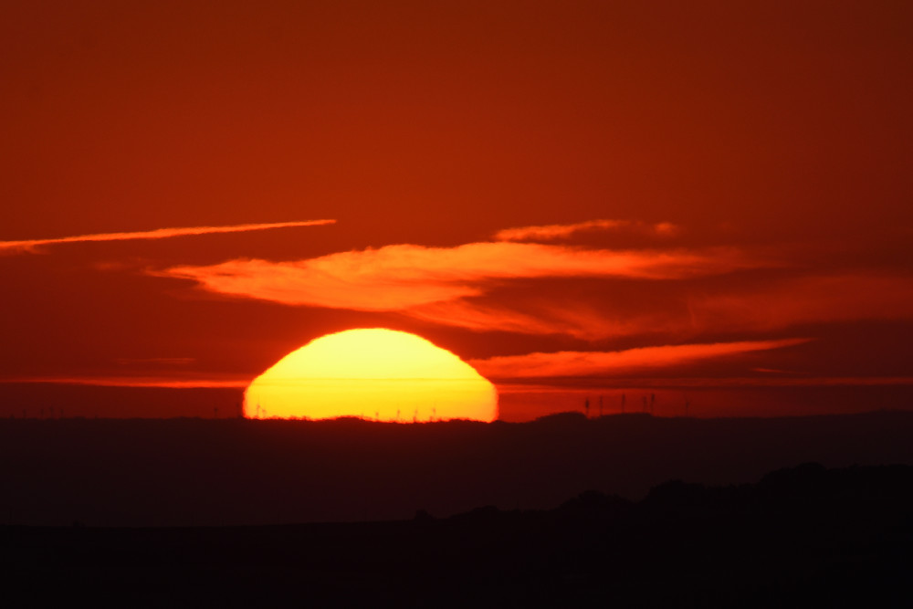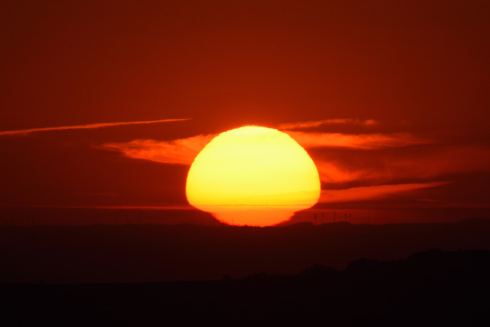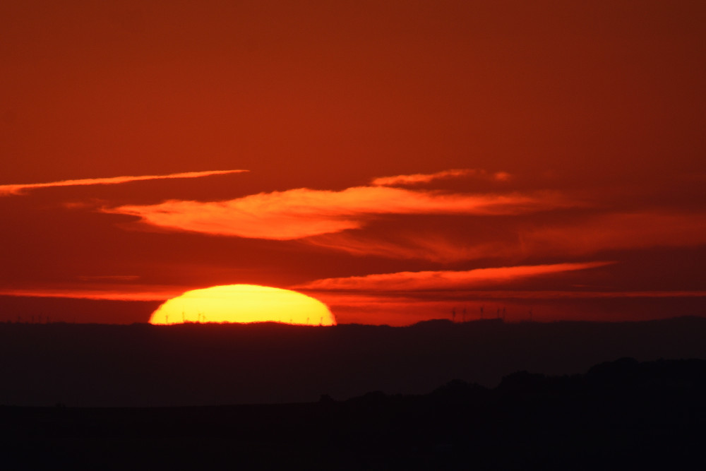 Des déformations variées du disque solaire peuvent survenir aussi bien au-dessus du sol que d'une étendue d'eau. C'est ce qui s'est produit au lever du Soleil en août 2022 et on retrouve, en 4.4, une forme déjà notée dans deux observations précédentes (images 2.5 et 3.9). Les éléments en avant-plan sont des éoliennes.