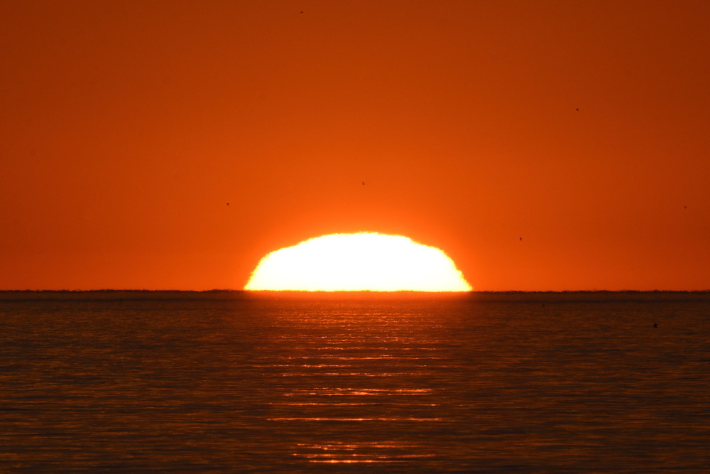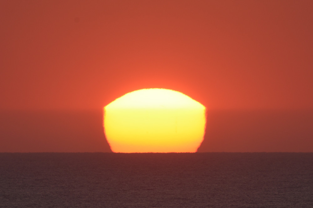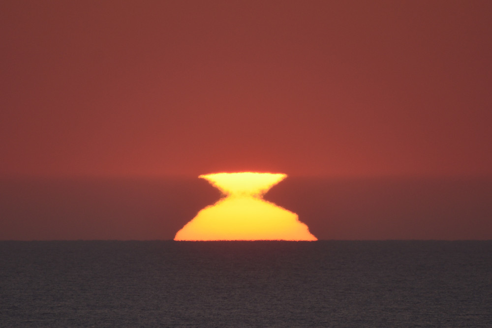 Les couchers de Soleil au-dessus de l'Océan Atlantique ne se ressemblent jamais et des surprises maintiennent toujours très vif l'intérêt et l'attrait de leur observation. Ainsi, en avril 2025 depuis Biarritz, observé depuis une altitude d'environ 2 m au-dessus de l'océan, le bord inférieur du Soleil a semblé bloqué sur un niveau situé à 3.4' au-dessus de l'horizon marin (image 10.4). Quelques instants après, à partir de 10.6, une deuxième image du Soleil apparaît entre ce niveau et l'horizon. En 10.7 et en 10.8, l'image semble symétrique de l'image supérieure droite.