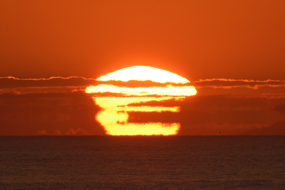 Après des déformations variées du disque solaire, quatre segments horizontaux ont été observés dans la phase finale d'un mirage vu en mai 2023 lors d'un coucher de Soleil à Biarritz (composition d'images 5.1 et vidéo 5.4). Un autre mirage a été observé le lendemain depuis le même site (image 5.2 et vidéo 5.5) et il a d'abord présenté une configuration différente avec une image inférieure à la convexité tournée vers le haut. Les photographies ont été effectuées au bord de l'océan à une altitude d'environ 2 m.