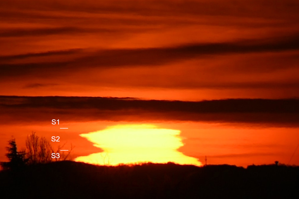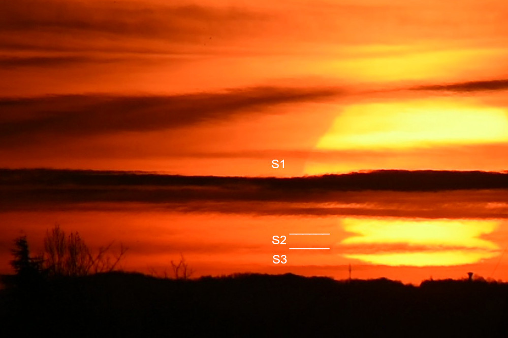 Au fur et à mesure de la descente du Soleil, son aplatissement augmente et, surtout, c'est son asymétrie qui devient de plus en plus importante (12.2 et 12.3). A partir de 12.3, l'image du Soleil franchit la couche d'inversion du gradient de température et c'est une configuration à trois images qui se met en place. Après une étonnante phase quasiment rectangulaire (12.7), ces trois images deviennent bien identifiables dans 12.8 avec, de haut en bas, une image droite S1, une image inversée S2 et une image droite S3. L'image 12.8 correspond à la même étape que l'image 1.2 pour l'observation n° 1 et 7.3 pour l'observation n° 7. En 12.10 S2 et S3 sont séparées, comme dans 7.2 et 1.4, puis, en 12.11, de faibles lueurs vertes apparaissent au sommet de l'image restante à un niveau qui trouve une correspondance en 12.5.