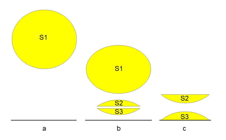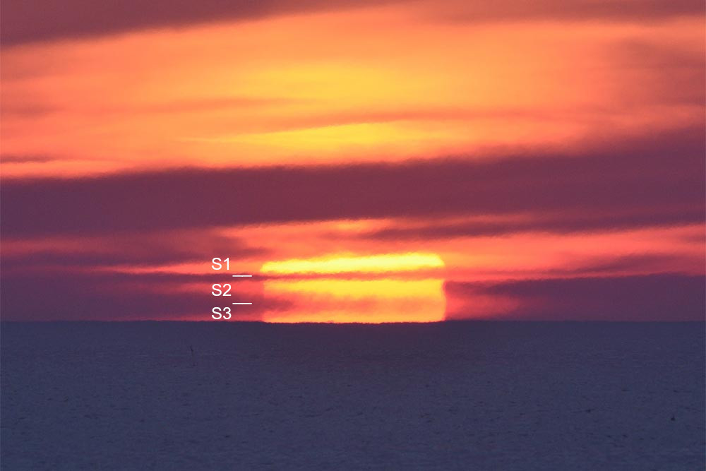 Dans 7.1 et 7.2 on pourrait être tenté de désigner S3 comme le "vrai" Soleil car c'est cette image qui apparaît la première avec une forme droite. Néanmoins, la fin du phénomène renverse cette hiérarchie vrai/faux car S2 et S3 disparaissent (7.7) au profit de l'image S1 qui s'élève dans le ciel et pourrait alors être considérée comme le "vrai" Soleil. Il faut donc se débarrasser de la tentation de conférer une valeur privilégiée à l'une des images car toutes sont des images du Soleil, seul change le chemin parcouru par la lumière.