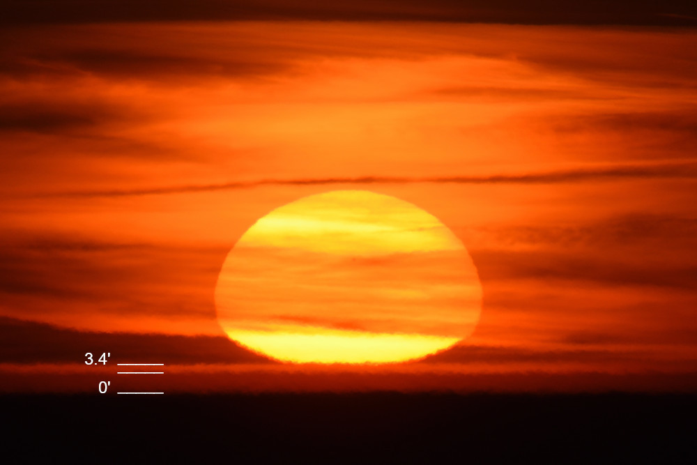 - l'étirement du bord inférieur du Soleil dans 14.3 apparaît à la même altitude (angulaire) que l'étirement du bord supérieur dans 14.7 ;