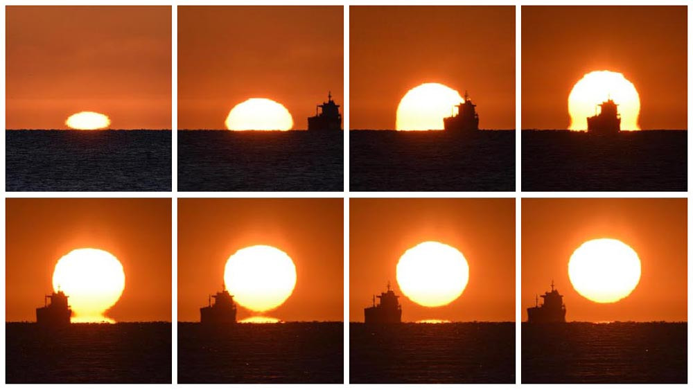 Pour les observations ci-dessous effectuées sur une plage de Port-la-Nouvelle (Aude) en janvier 2022 (images 1.1 à 1.5) et février 2022 (images 1.6 à 1.10), les premières images de chaque série montrent un Soleil lenticulaire semblant flotter au-dessus de la Mer Méditerranée (1.2 et 1.6) : la partie inférieure est l'image symétrique de la partie supérieure avec une légère compression. Le cargo qui s'est invité dans la série de février 2022 a subi lui aussi un mirage inférieur en montrant une symétrie pour certains de ses éléments inférieurs, ainsi que son remorqueur.