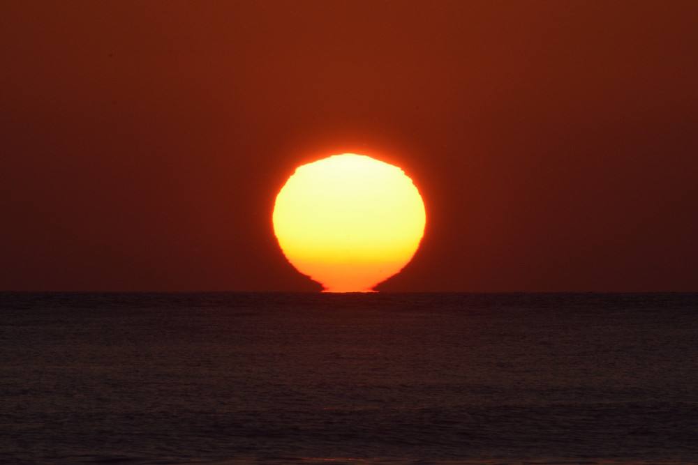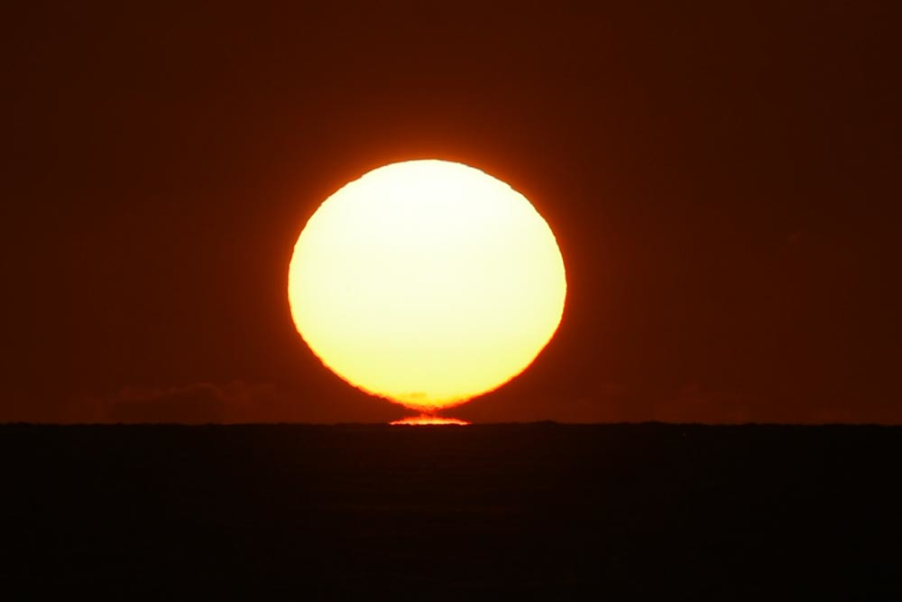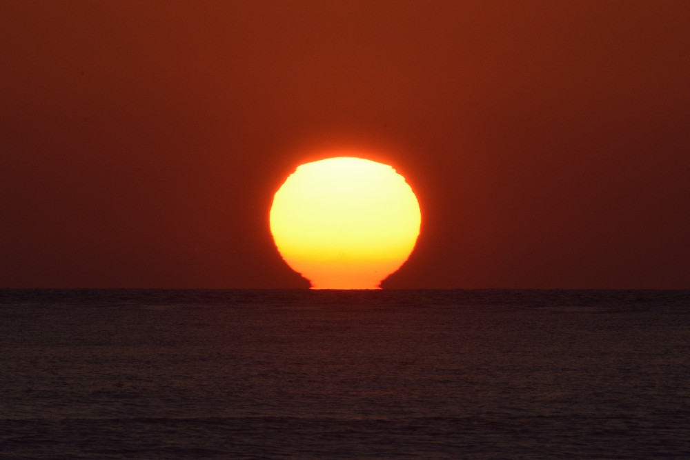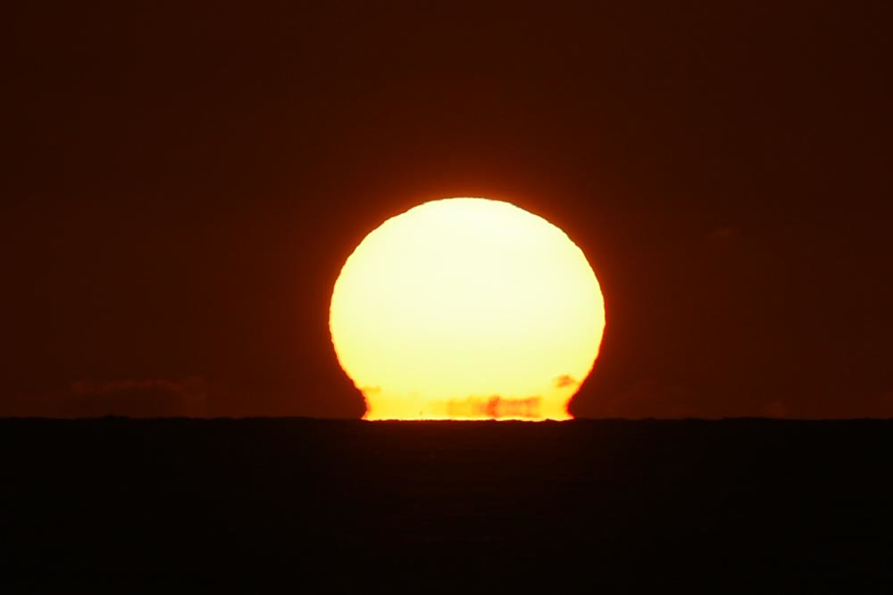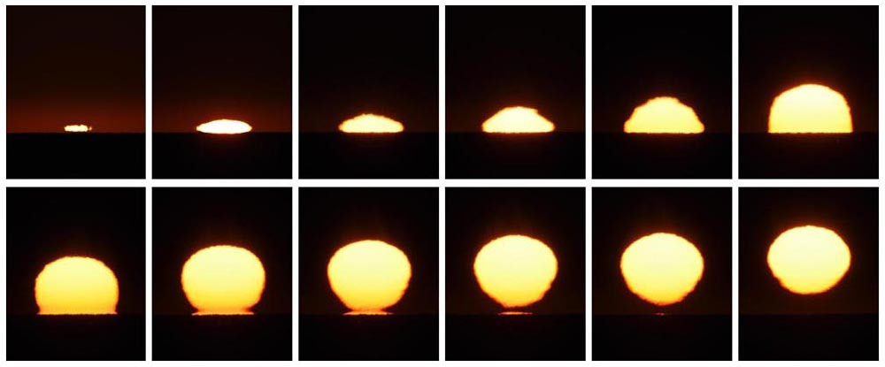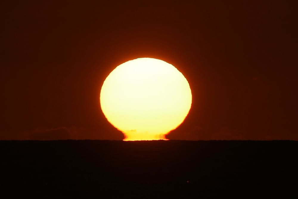 Comme pour des objets terrestres, le Soleil peut subir le phénomène de mirage inférieur avec la présence d'une image inversée sous l'image directe. La surface de la mer présente un grand avantage par rapport à une surface terrestre : sa planéité assure que les couches d'air successives offrent un profil vertical de température plus régulier qu'au-dessus d'un relief terrestre d'altitude et de nature souvent variables. Les mirages inférieurs qui en résultent montrent alors la forme caractéristique du Soleil en omega Ω avec l'apparition d'une image secondaire inversée sous le Soleil. Toutes les photographies présentées dans cette page ont été effectuées au bord de la mer avec un point d'observation à une altitude d'environ 2 m.