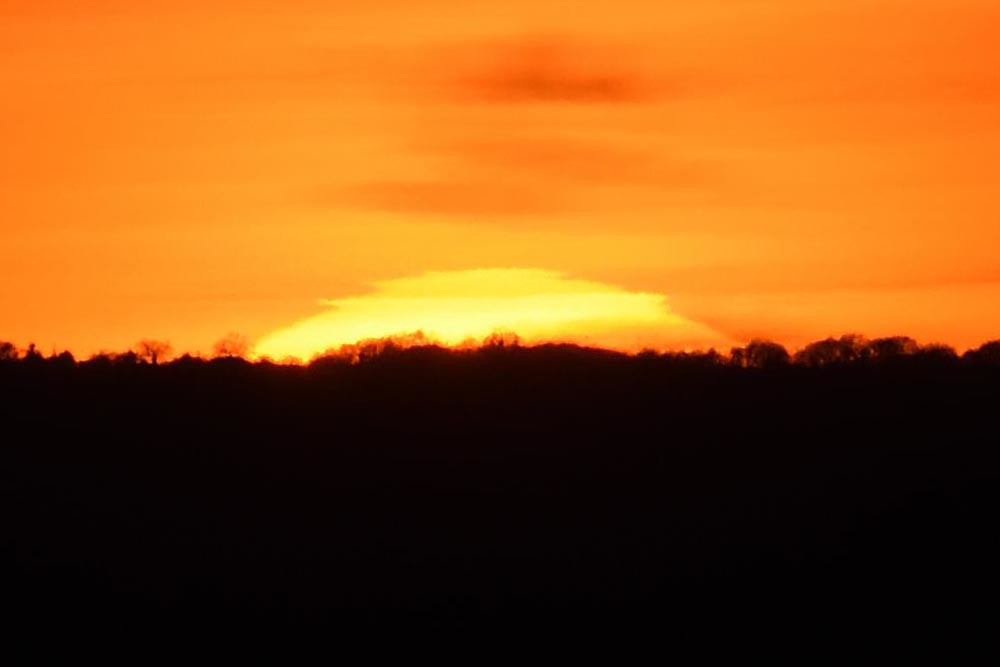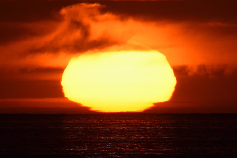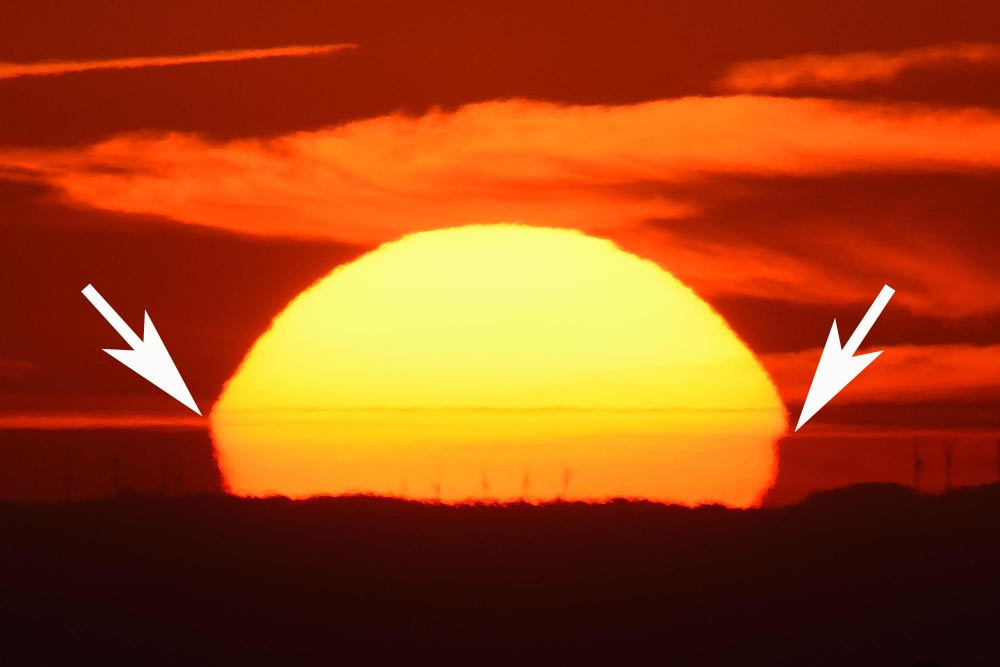 - du côté droit du disque solaire, le décrochage horizontal du limbe est au même niveau qu'une bande nuageuse visible aussi bien à l'extérieur du Soleil (fine ligne claire) que devant lui (bande sombre) ;