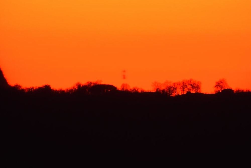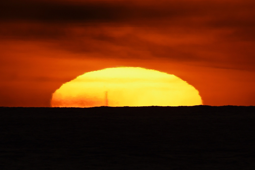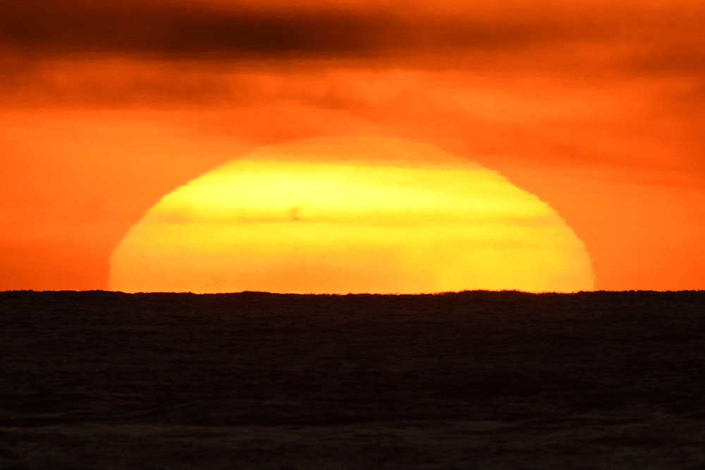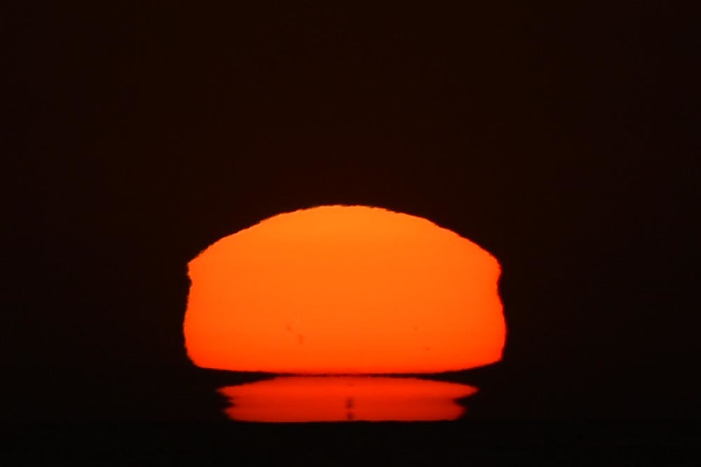 La réfraction très intense a produit un Soleil très aplati (image 3.1) et des étirements verticaux spectaculaires pour une forêt située à une centaine de kilomètres du site d'observation (image 3.2). Au cours de la descente du Soleil vers l'horizon, il est passé par un niveau de forte variation de l'indice de réfraction qui a causé un dédoublement de la tache solaire présente au centre de l'image 3.1. Les deux images de cette tache apparaissent bien dans l'image 3.2 où les fortes turbulences altèrent grandement le contour du disque solaire par rapport à 3.1. Une petite précision technique est nécessaire à propos du fait que, dans 3.2, le Soleil semble très légèrement plus large que dans 3.1. En 3.1, le Soleil était plus élevé qu'en 3.2, donc beaucoup plus brillant ce qui a nécessité, pour bien faire apparaître la tache, d'appliquer un contraste très important lors du traitement de l'image par ordinateur : les bords droit et gauche de 3.1 en ont été atténués, faisant paraître le Soleil moins large que dans 3.2.