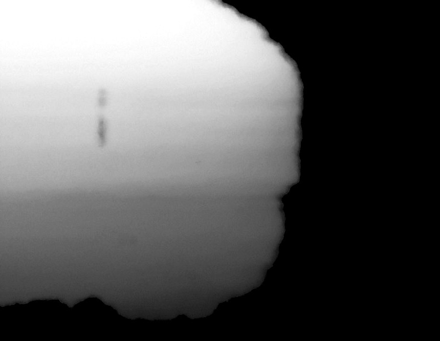 Dans les images extraites de la vidéo (résolution très inférieure à celle d'une photographie), la tache solaire est très faiblement visible dans la première image (flèche, image 2.1), puis elle apparaît en plusieurs exemplaires dans les suivantes (2.2 et 2.3).