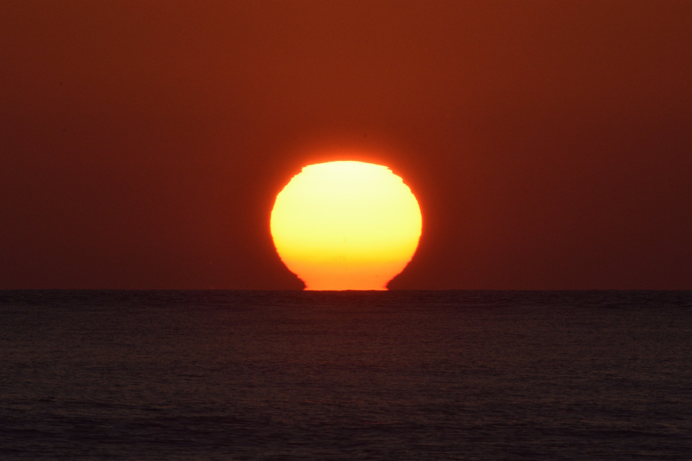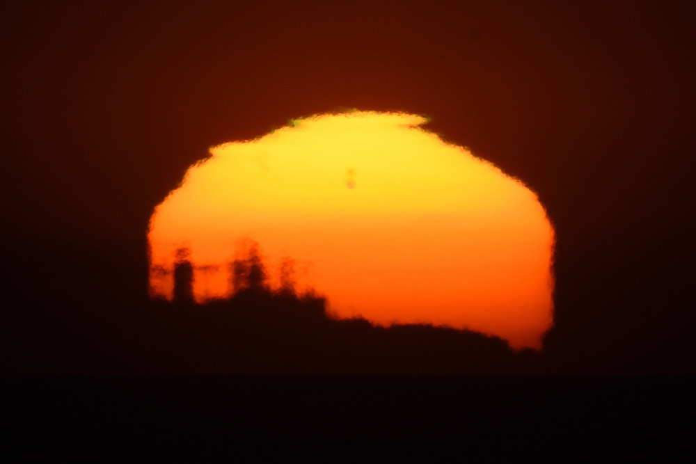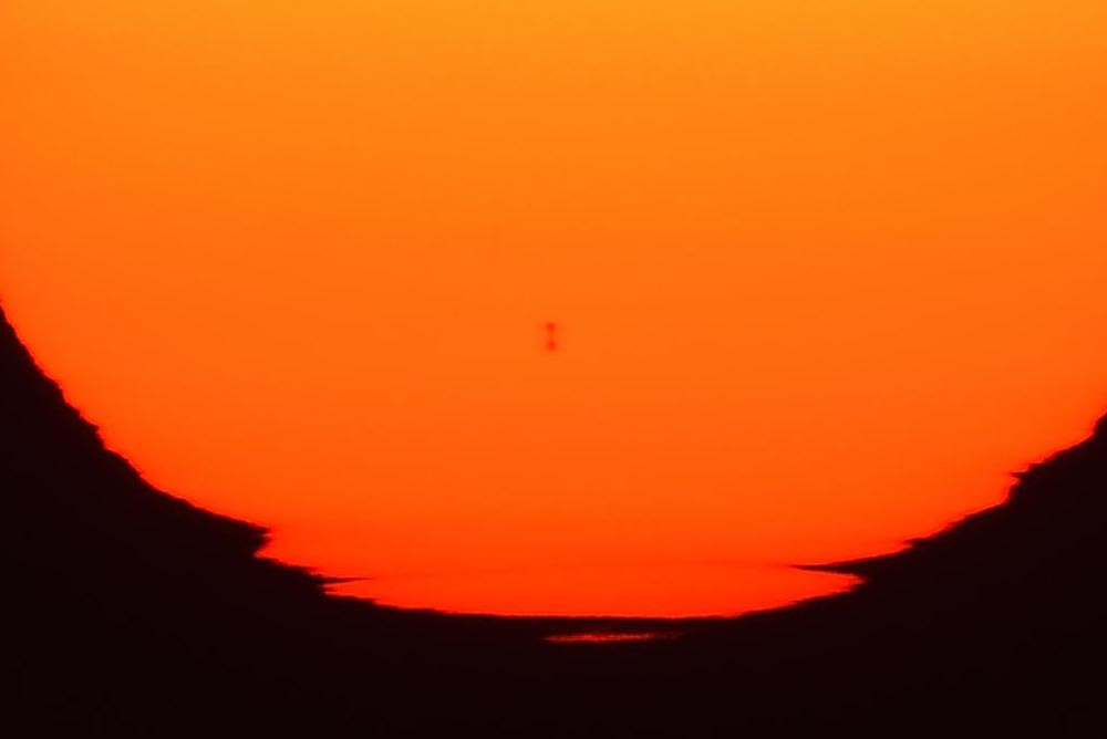 Les images suivantes, effectuées à Biarritz au coucher du Soleil, présentent le dédoublement d'une tache solaire au passage du Soleil par une zone où l'indice de réfraction a varié brusquement. Alors que les turbulences atmosphériques étaient particulièrement importantes et dégradaient beaucoup la qualité des photographies, la prise de nombreuses images a permis, par chance, d'en obtenir une (une seule !) avec une netteté telle que la principale tache solaire présente ce jour-là a pu montrer quelques détails dans sa structure.