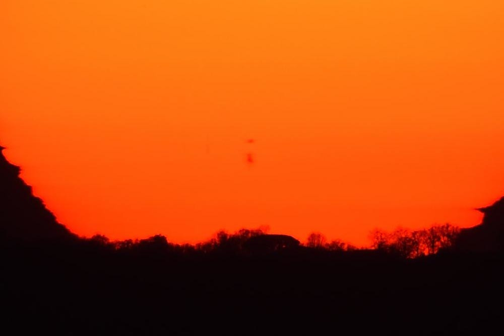 Lors d'un coucher de Soleil photographié depuis Toulouse en avril 2022, au fur et à mesure de l'abaissement de notre étoile, une tache est observée d'abord normalement (image 1.1), puis en deux (1.2) ou trois (1.3 à 1.5) exemplaires à cause de variations brusques de la réfraction par l'atmosphère. Les images sont centrées sur la tache pour une comparaison plus aisée de l'évolution du phénomène.