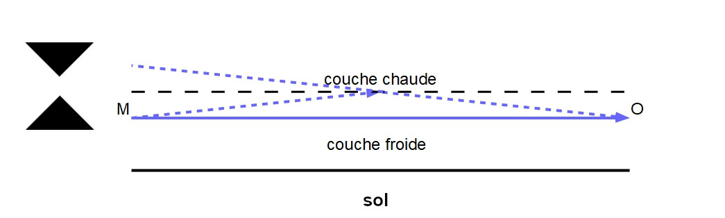 Quand la température d'une couche d'air est supérieure à celle de la couche sous-jacente, deux images peuvent apparaître pour un objet situé dans la couche inférieure : l'une en trajet direct, c'est-à-dire le trajet habituel de la lumière pour une image droite, et l'autre, inversée, au-dessus. On peut visualiser la situation en considérant que le trajet suivi par la lumière, issue d'un point dans la couche de température inférieure, se produit comme si une réflexion totale avait lieu sur le dioptre qui sépare les deux couches pour un angle d'incidence supérieur à l'angle d'incidence minimal présenté dans les figures 1 et 2 de la page de présentation de la réfraction.