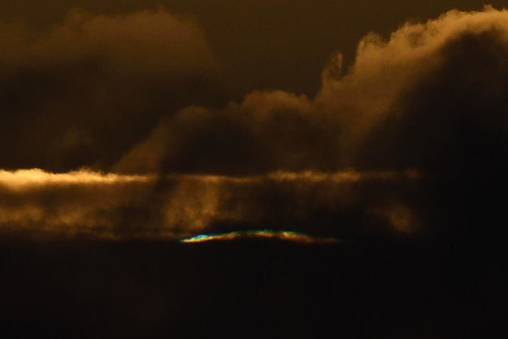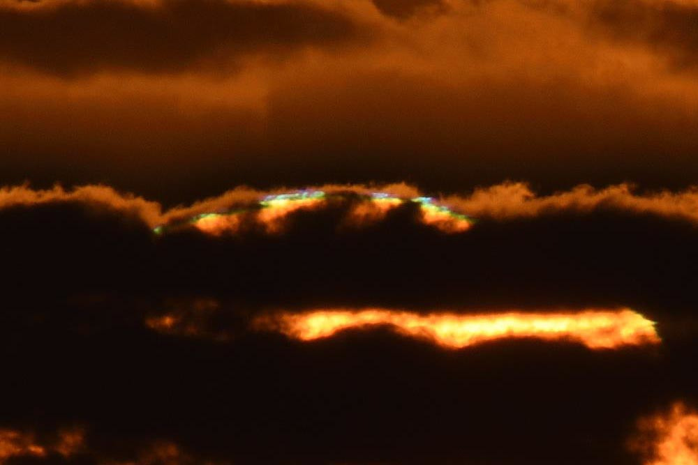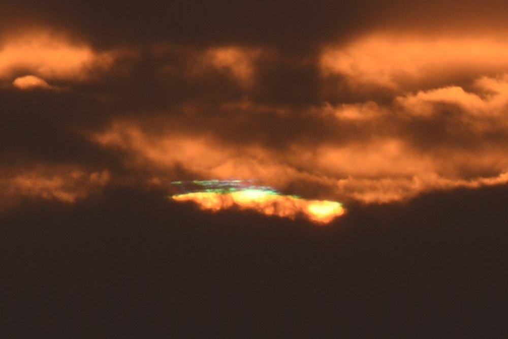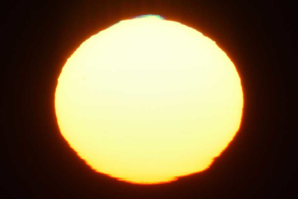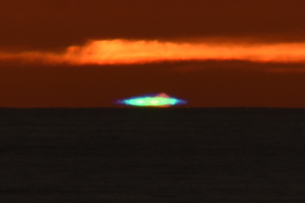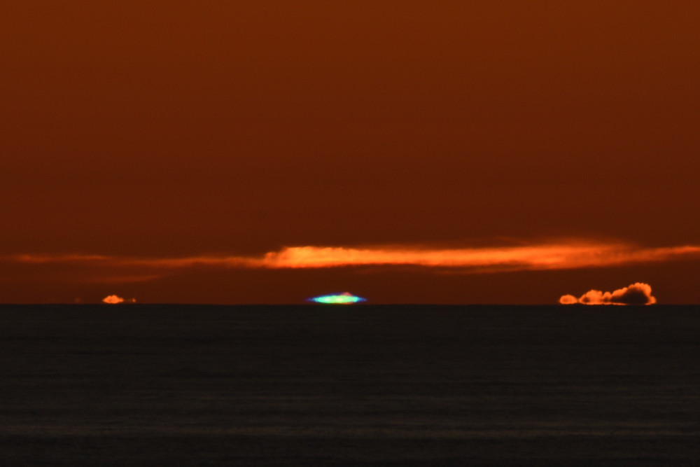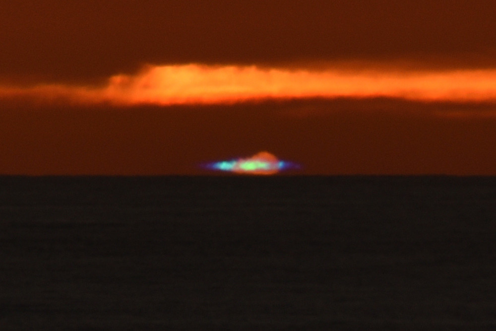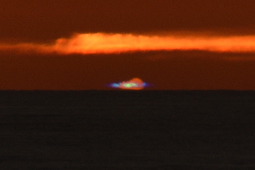 Une observation d'une configuration rare a été effectuée lors d'un coucher du Soleil en juin 2025 à Anglet (Pyrénées-Atlantiques). Le point d'observation était situé en surplomb de l'Océan Atlantique, à une altitude de 49 m, et un mirage inférieur (image 1.1) est survenu 3 min 29 sec avant l'événement du jour. Des petits nuages étaient présents à l'horizon ouest (cf. photo 1.7 de la page sur le mirage inférieur pour les nuages) et l'un d'eux, minuscule, était exactement sur la ligne de visée de l'ultime rayon du Soleil. Dans la vue générale de l'image 1.2 (avec mirage inférieur pour les nuages), un rayon vert particulièrement brillant apparaît après la disparition du disque brillant du Soleil : le centre est vert et on distingue un peu de bleu dans les extrémités gauche et droite. Des images de meilleure résolution permettent de préciser la situation : la photographie 1.3 est une image agrandie de 1.2, et 1.4 et 1.5 sont des vues, à la même échelle, réalisées 0.65 seconde et 0.92 seconde après 1.3 (la série complète comporte huit photographies en 1.65 seconde). Les images 1.3 à 1.5 sont alignées par rapport au petit nuage. Malgré la mise au point de qualité dégradée, on distingue sans ambiguïté les éléments suivants : |