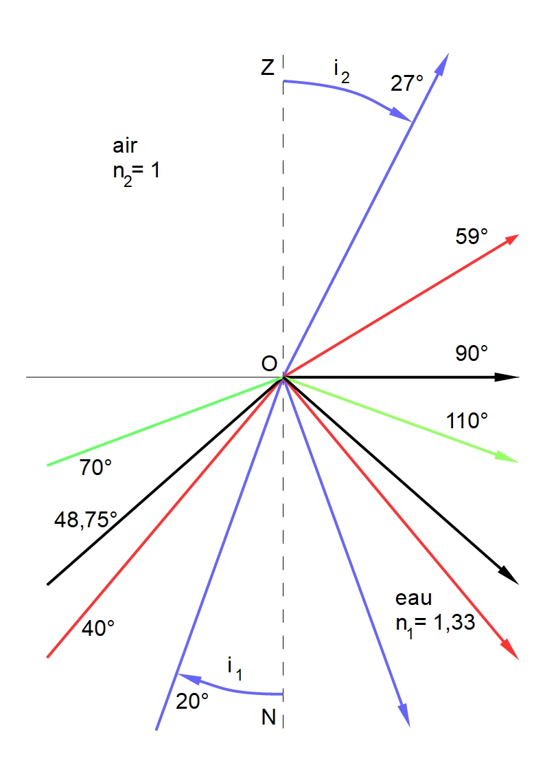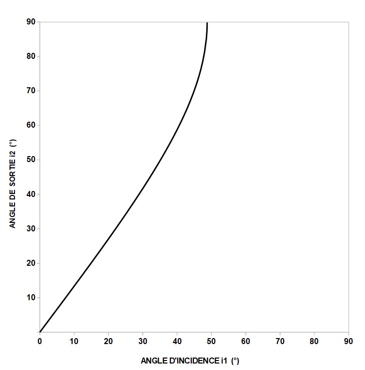 1. La loi de Snell-DescartesL'indice de réfraction est noté n ; il est égal à 1,33 dans l'eau et 1 dans l'air. n1 et n2 étant les indices de réfraction de ces deux milieux, l'angle du rayon incident i1 est relié à celui du rayon de sortie i2 selon la loi suivante :