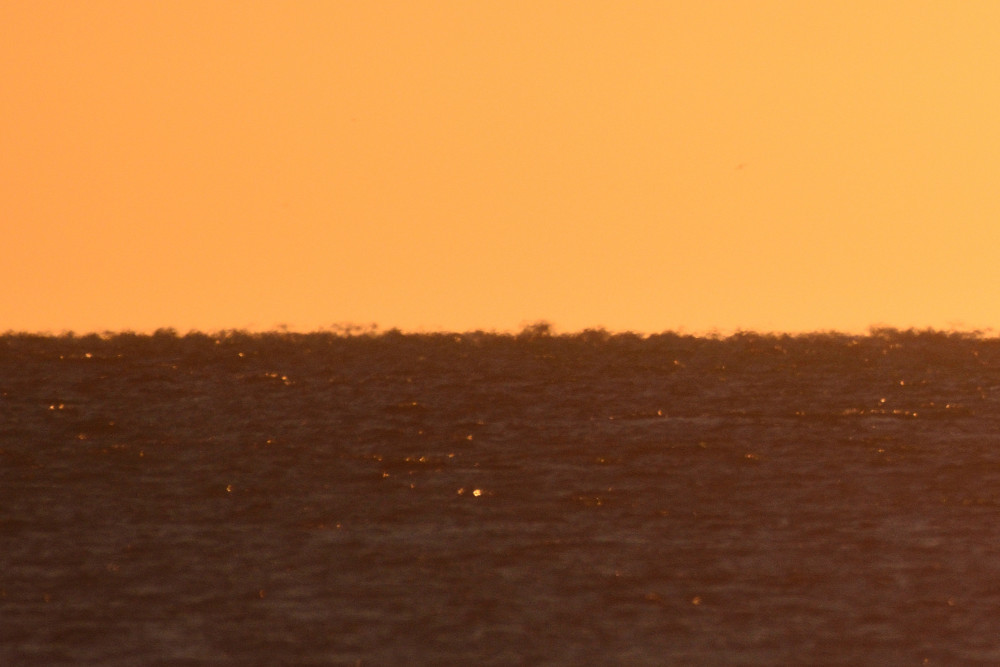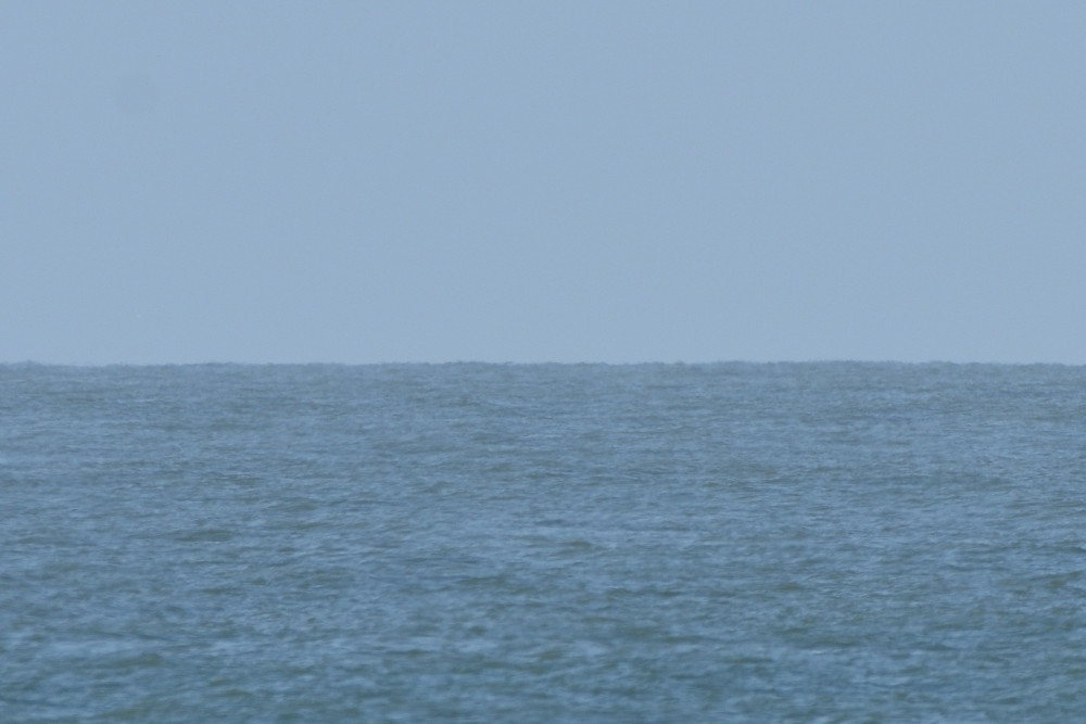 Pour finir cette présentation, la linéarité de l'horizon marin est radicalement différente selon l'état de la réfraction juste au-dessus de l'eau : rectiligne en situation calme (image 2.1, aucun mirage) ou très perturbé, comme déchiqueté, en raison d'importantes variations locales de la réfraction (image 2.2 avec mirage inférieur ce matin-là). Cette dernière situation est encore mieux visible dans une vidéo réalisée dans les mêmes conditions. Les images 2.1 et 2.2 correspondent au même zoom optique (focale 500 mm) et au même redimensionnement (2000 pixels redimensionnés à 1000 pixels pour l'image affichée).